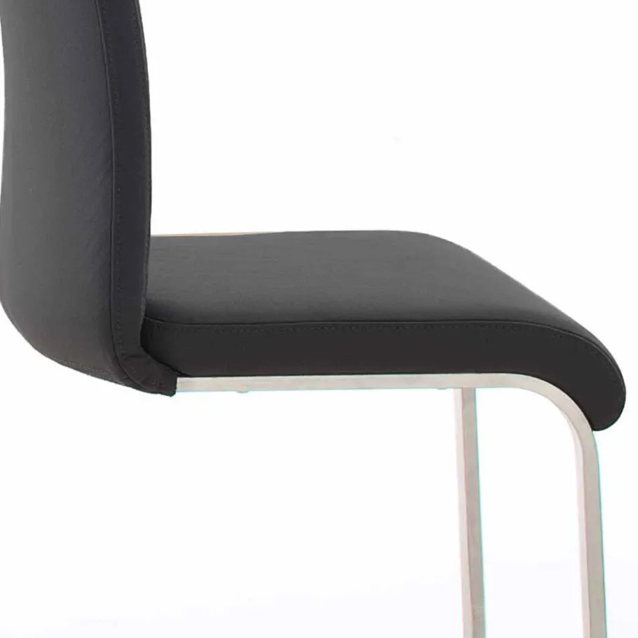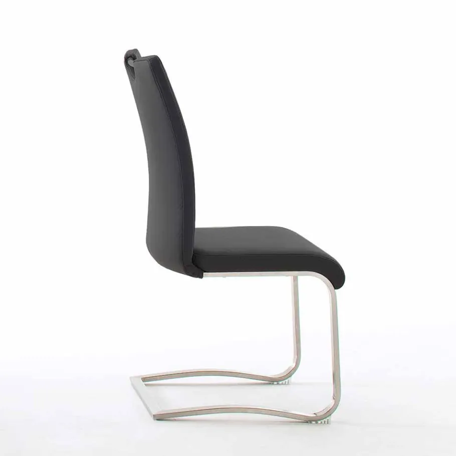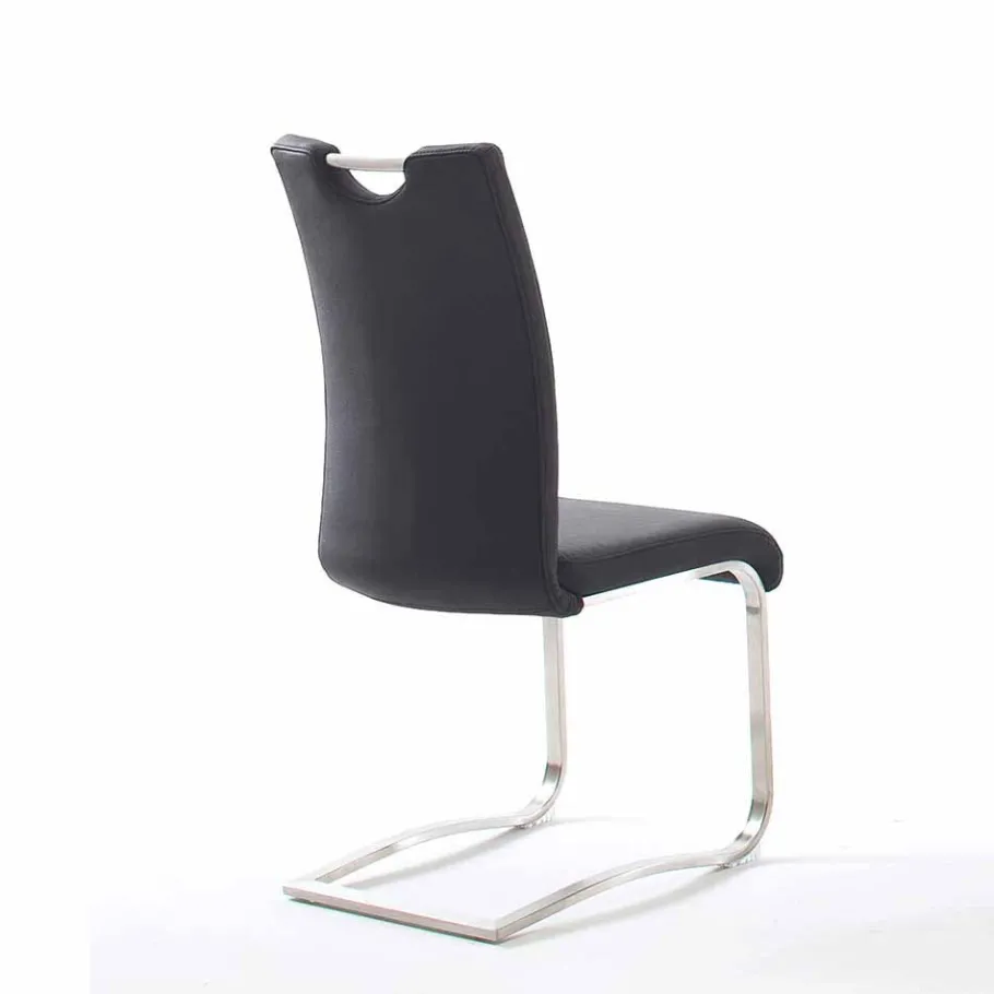 Das robuste Schwing-Flachrohrgestell aus gebürstetem Edelstahl garantiert eine außergewöhnliche Stabilität und eine Belastbarkeit von bis zu 140 kg. Die spezielle Konstruktion des Freischwingers passt sich Ihrem Körpergewicht leicht an, was den Sitzkomfort zusätzlich verbessert. Gleichzeitig bleibt der Stuhl flexibel und wirkt nie zu starr. Ein weiteres praktisches Detail ist der handliche Edelstahlgriff in der Rückenlehne. Dieser Griff ermöglicht ein einfaches Positionieren des Stuhls, ohne dass man ihn mühsam anheben muss – perfekt, wenn Sie häufig umstellen oder den Essbereich schnell umgestalten möchten.