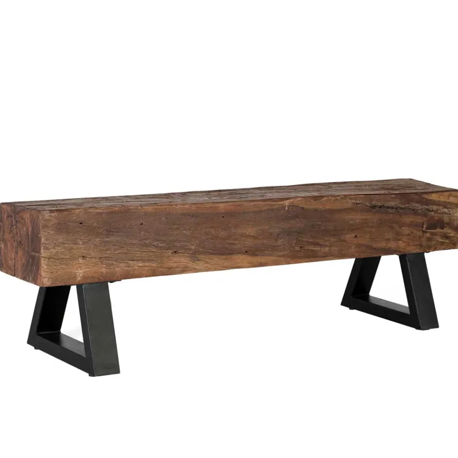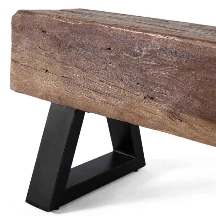 Jede „Evinele“ Bank erzählt ihre eigene Geschichte: Der Sitz besteht aus einem massiven Balken aus hochwertigem Recyclingholz, das durch seine grobe Struktur, Risse, Astlöcher und natürliche Unebenheiten seinen ganz besonderen Charakter erhält. Diese Spuren des Lebens verleihen dem Möbelstück einen authentischen, charmanten Look – jede Bank ist ein handgefertigtes Unikat mit einzigartiger Maserung und Patina.