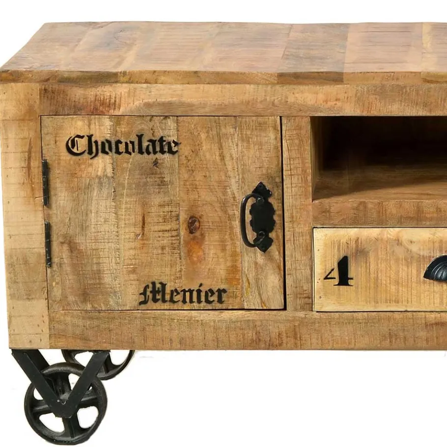 Die Rollen, Muschel- und Bügelgriffe des Lowboards sind aus schwarz lackiertem Metall gefertigt und setzen einen kontrastreichen Akzent zum warmen Mangoholz. Dieses Zusammenspiel aus Materialien verleiht dem Lowboard einen einzigartigen Vintage-Look, der jeden Raum aufwertet.