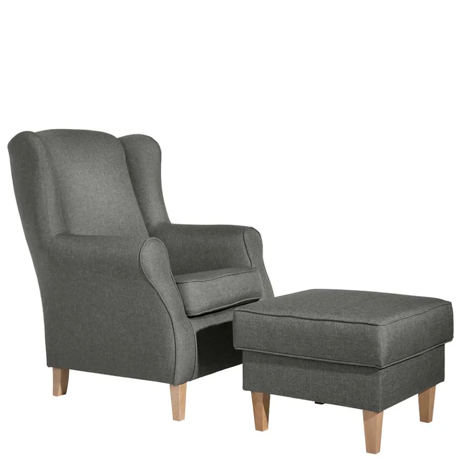 Der Sessel „Nurcias“ wird wahlweise als Einzelmöbelstück (Variante 001) oder im zweiteiligen Set mit einem passenden Fußhocker (Variante 002) angeboten. Der Fußhocker ist 53 cm breit, 45 cm hoch und 53 cm tief und verfügt über ein Basisgestell aus Holz und Holzwerkstoff sowie eine Polsterung aus mittelfestem Schaumstoff. Beide Möbelstücke werden fertig montiert geliefert, lediglich die Holzfüße müssen noch von Ihnen angebracht werden.
