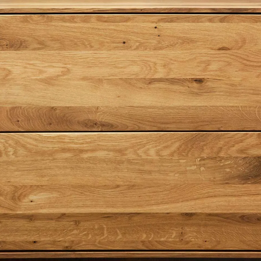 - Aus Wildeiche Massivholz (durchgehende Lamelle) und Stahl gefertigt, Rückwand aus Spanplatte
