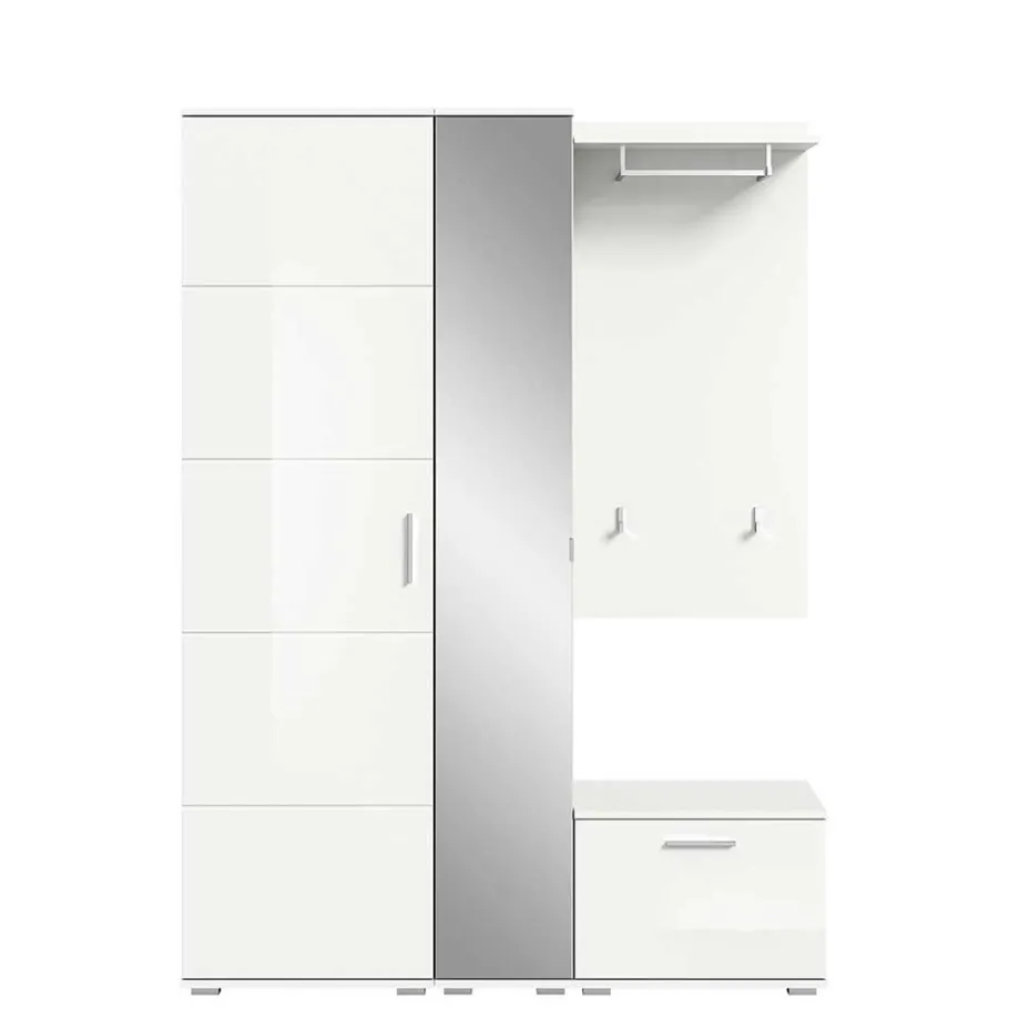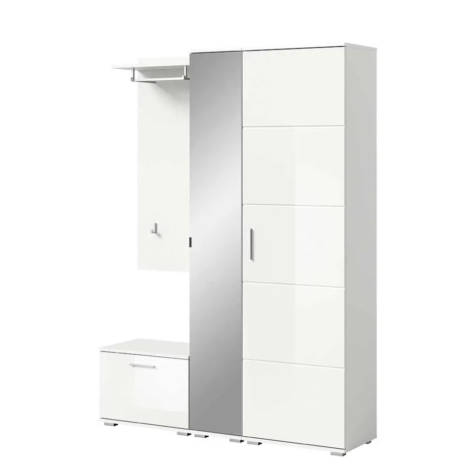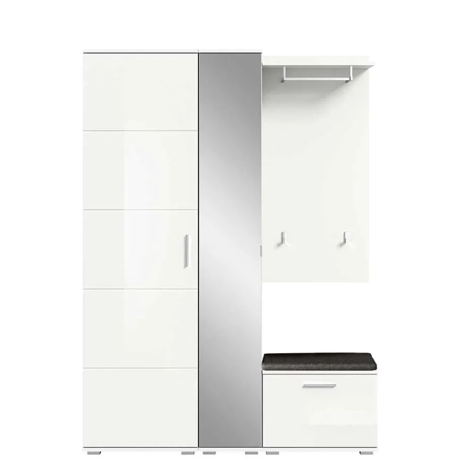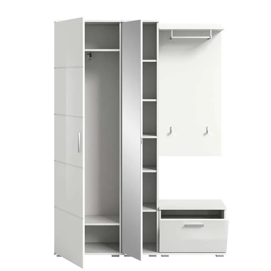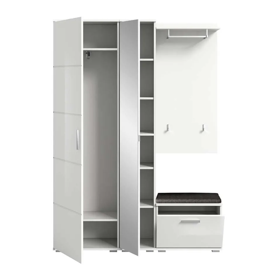 Mit einem durchdachten, modernen Design, das auf klare Formen und elegante Details setzt, strahlt das Garderobenmöbel-Set eine zeitlose Schönheit aus. Die Kombination aus matt-weiß folierten Oberflächen und den hochglänzenden Fronten in Rillenoptik lässt das Möbelstück sowohl edel als auch einladend wirken. Besonders hervorzuheben ist die Front des Spiegelschranks, die mit Spiegelglas ausgestattet ist – ein Element, das nicht nur funktional, sondern auch optisch beeindruckend ist. Der Glanz des Spiegels sowie das glänzende Weiß bringen Licht in den Raum und lassen ihn größer wirken. Diese Möbel passen sich harmonisch in jede Umgebung ein und bieten gleichzeitig eine faszinierende Mischung aus modernem Design und praktischer Funktionalität.