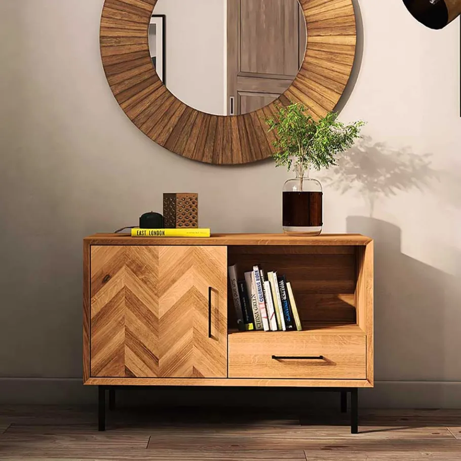 Des Weiteren begeistert die Kommode „Kerfa“ mit einer Tür, die mit gedämpften Metallbeschlägen ausgestattet ist. Die Türfront ist kunstvoll mit einem effektvollen Fischgrätmuster gestaltet, das einen eleganten Akzent setzt. Im Innenraum finden Sie einen Einlegeboden, der Ihnen die Organisation Ihrer Gegenstände erleichtert. Die handlichen Metall-Bügelgriffe runden das Gesamtbild ab und ermöglichen eine bequeme Handhabung.