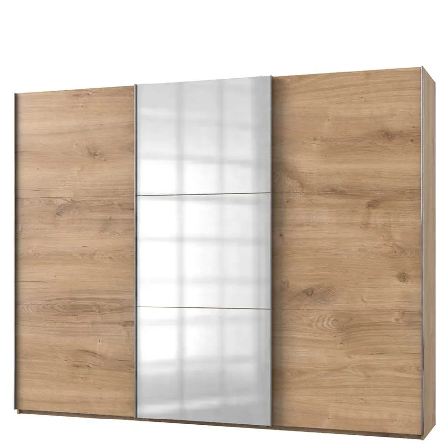 Die drei Schwebetüren gleiten sanft und leise, ermöglicht durch hochwertige Beschläge und Führungen. Die mittlere Tür ist mit einem großzügigen Ganzkörperspiegel ausgestattet, der nicht nur praktisch für die tägliche Outfit-Wahl ist, sondern auch optisch den Raum vergrößert. Die handlichen Metall-Griffleisten in Chromfarben erleichtern das Öffnen und Schließen und setzen einen eleganten, farblichen Kontrast.