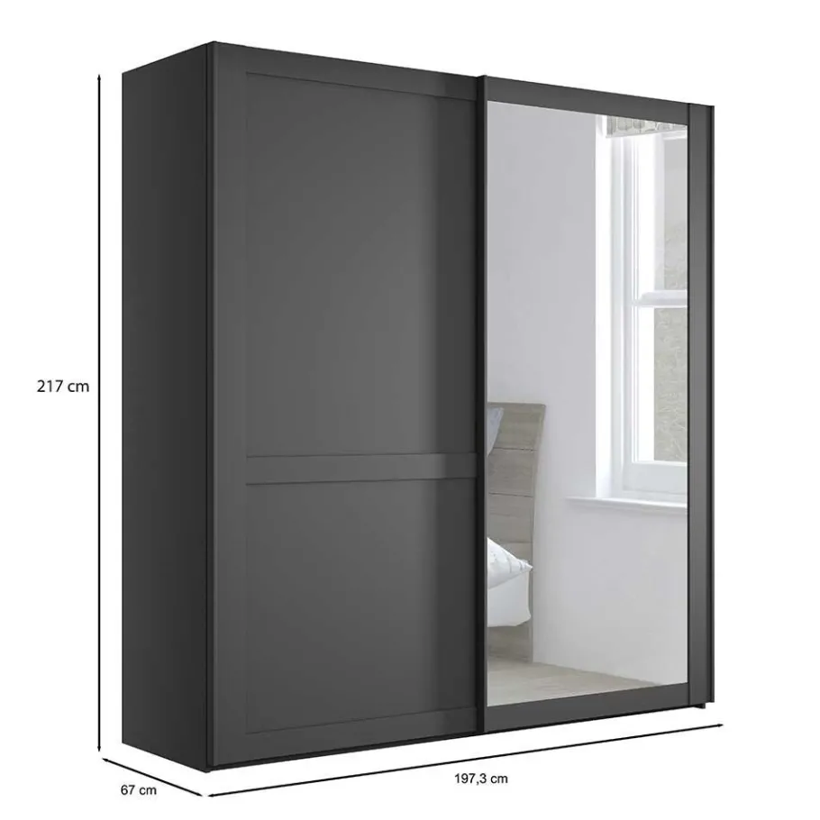 Mit seinen imposanten Abmessungen von 217 cm Höhe, 67 cm Tiefe und wahlweise 150 cm oder 200 cm Breite bietet der „Mataram“ ausreichend Stauraum für Ihre Kleidung und persönlichen Gegenstände. Die zwei leichtgängigen Schwebetüren lassen sich mühelos öffnen und schließen, während die dezente Kassettenoptik der Türfronten dem Schrank eine elegante Note verleiht.