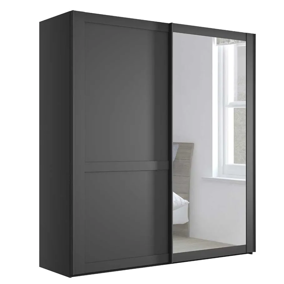 Der Schwebetürenschrank „Mataram“ verkörpert die perfekte Symbiose aus modernem Design und dem zeitlosen Charme des Landhausstils. Hergestellt in Deutschland aus hochwertiger Spanplatte, zeichnet sich dieses Möbelstück durch seine erstklassige Verarbeitung und Materialqualität aus. Die strapazierfähige, dunkelgraue Folie der äußeren Oberflächen harmoniert perfekt mit dem hellgrauen Holzoptik-Innendekor, was eine ansprechende und leicht kombinierbare Farbgebung ergibt.
