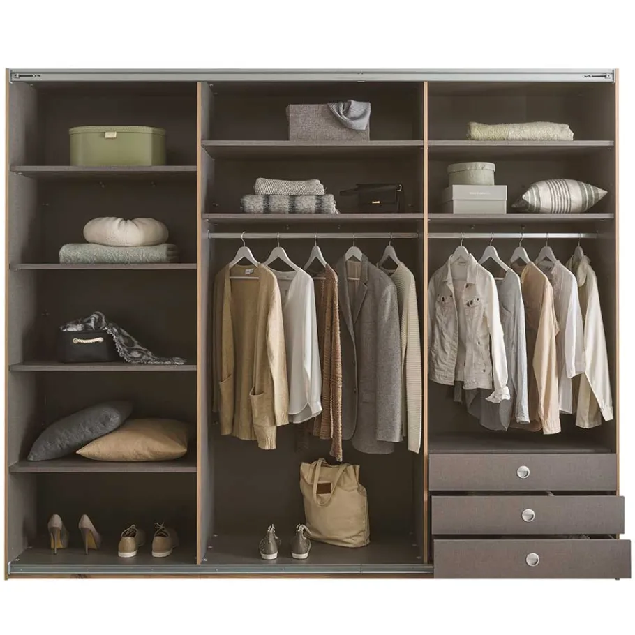 - Innen drei Facheinheiten, links vier Einlegeböden, mittig und rechts jeweils zwei Einlegeböden und eine Kleiderstangen