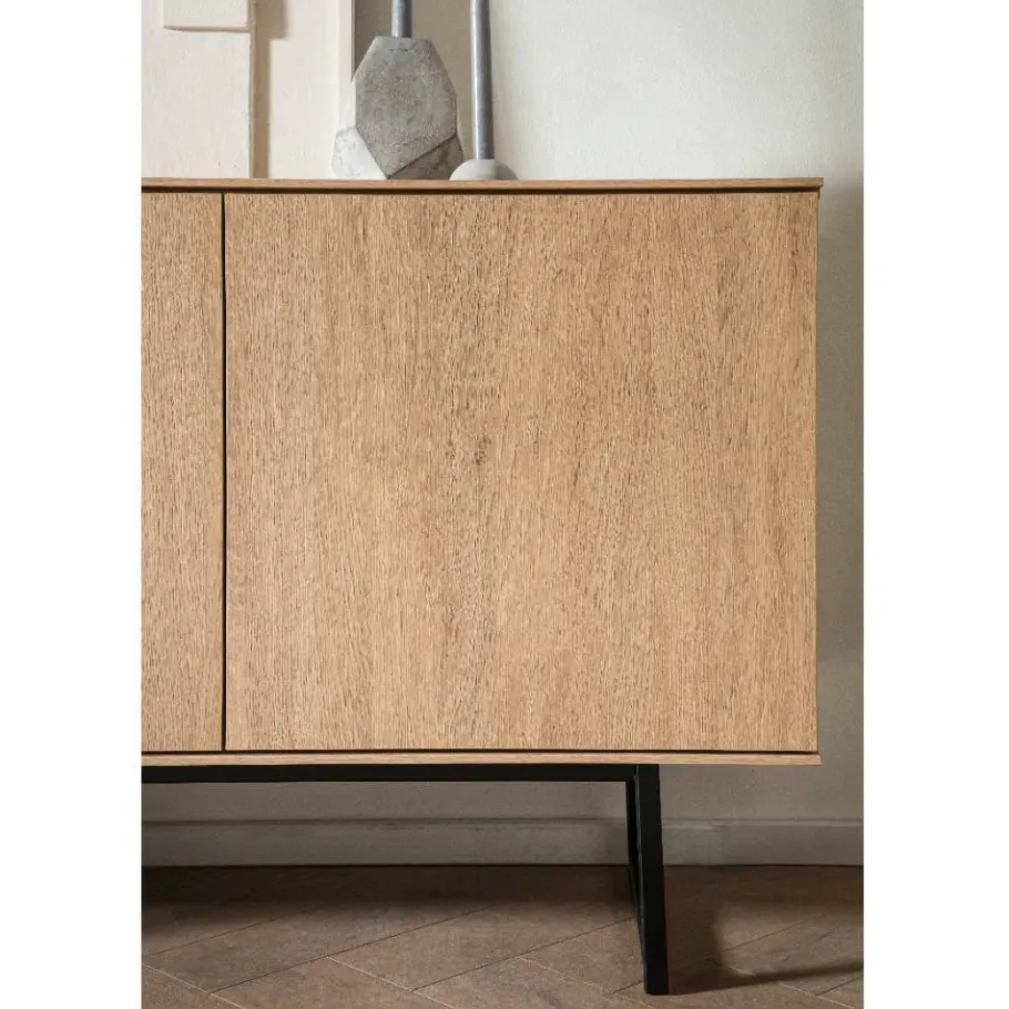 Gefertigt aus robustem Holzwerkstoff und veredelt mit einer melaminbeschichteten Oberfläche in Eiche Stone, überzeugt die Türen-Kommode „Jaskin“ durch Pflegeleichtigkeit und langlebige Qualität. Das schwarze Metallgestell mit Pulverbeschichtung bildet einen spannenden Kontrast zur Holzoptik und sorgt für einen stabilen Stand sowie einen Hauch von Industrial-Flair.