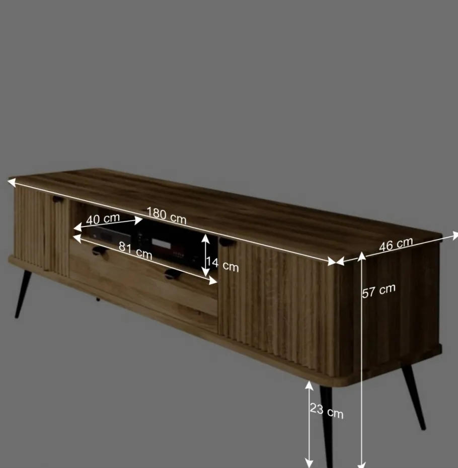 Mit Maßen von 180 cm Breite, 57 cm Höhe und 46 cm Tiefe bietet das TV-Lowboard ausreichend Stauraum für Ihre Mediengeräte und Zubehör. Das offene Gerätefach mit den Innenmaßen von ca. 81x14x40 cm ermöglicht eine praktische Unterbringung Ihrer Geräte. Ein Loch in der Rückwand bietet eine saubere Kabelführung.