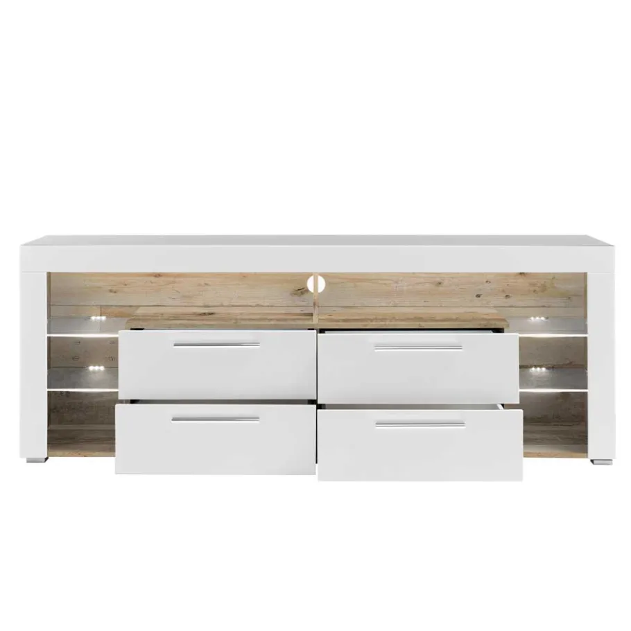 Eine Öffnung in der Rückwand des TV-Boards dient als Kabeldurchlass und ermöglicht eine ordentliche Kabelführung, um lästiges Kabelgewirr zu vermeiden. Die integrierte LED-Beleuchtung setzt Ihre Deko gekonnt in Szene und sorgt für eine stimmungsvolle Atmosphäre in Ihrem Wohnbereich, besonders abends oder bei Filmabenden. Die modischen Metall-Griffleisten an den Schubkästen verleihen dem Möbelstück eine moderne Note und ermöglichen ein müheloses Öffnen und Schließen der Schubladen.