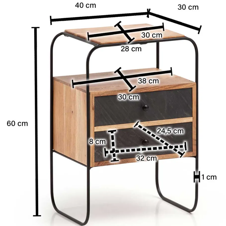 Die zweifarbige Nachtkommode „Avalun“ vereint modernes Design mit funktionaler Eleganz. Ihr einzigartiger Look in Akazie Natur und Schwarz macht sie zum Highlight in jedem Schlafzimmer. Mit ihrer filigranen Metall-Bügelgestell und den charmanten Rundungen steht sie sicher und stabil. Perfekt für jeden, der ein stilvolles und zugleich praktisches Möbelstück sucht. Die Kommode „Avalun“ wird in Handarbeit gefertigt und ist somit ein echtes Unikat – kleine Abweichungen unterstreichen ihren individuellen Charakter.