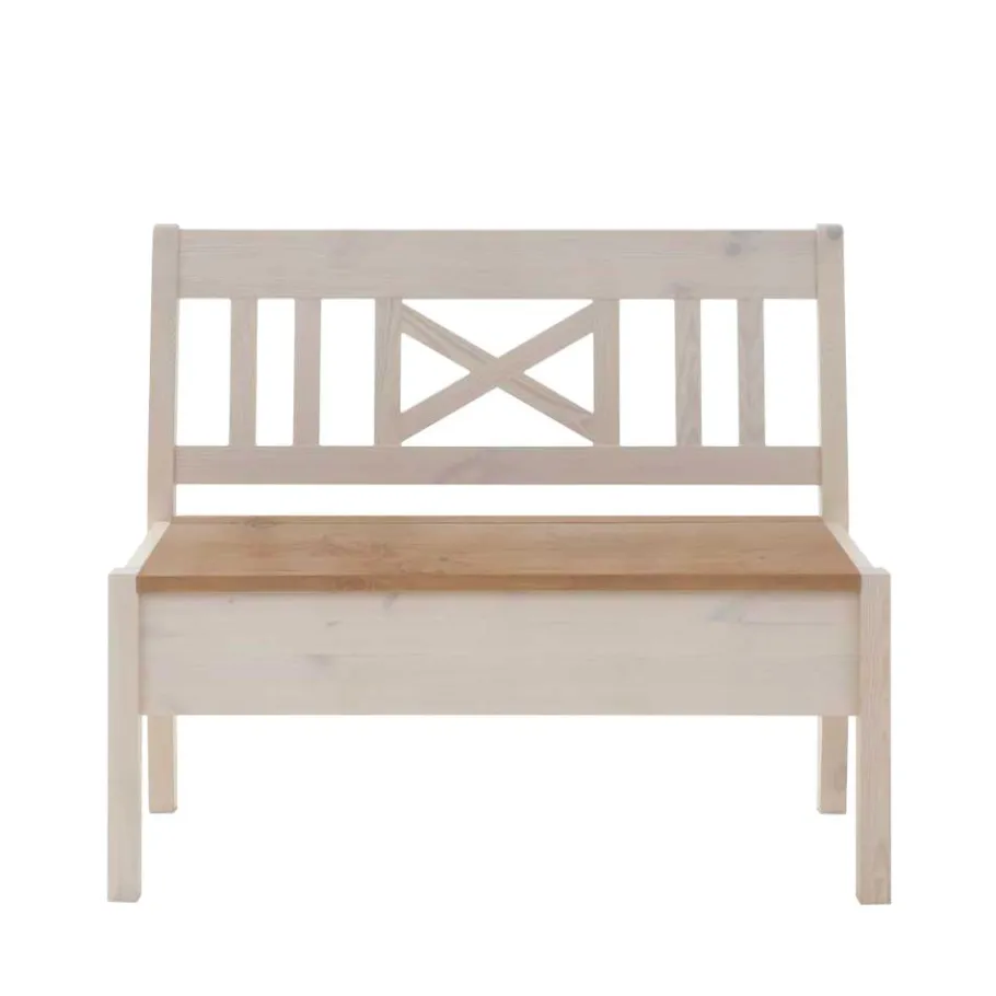 Entdecken Sie die Truhenbank Lugon – Ihre praktische Sitzgelegenheit, die bezaubernden Landhausflair in jeden Wohnraum bringt. Der attraktive Farbkontrast aus strahlendem Weiß und warmem Kiefer Laugenfarbig verleiht Ihrem Zuhause eine einladende und gemütliche Atmosphäre.