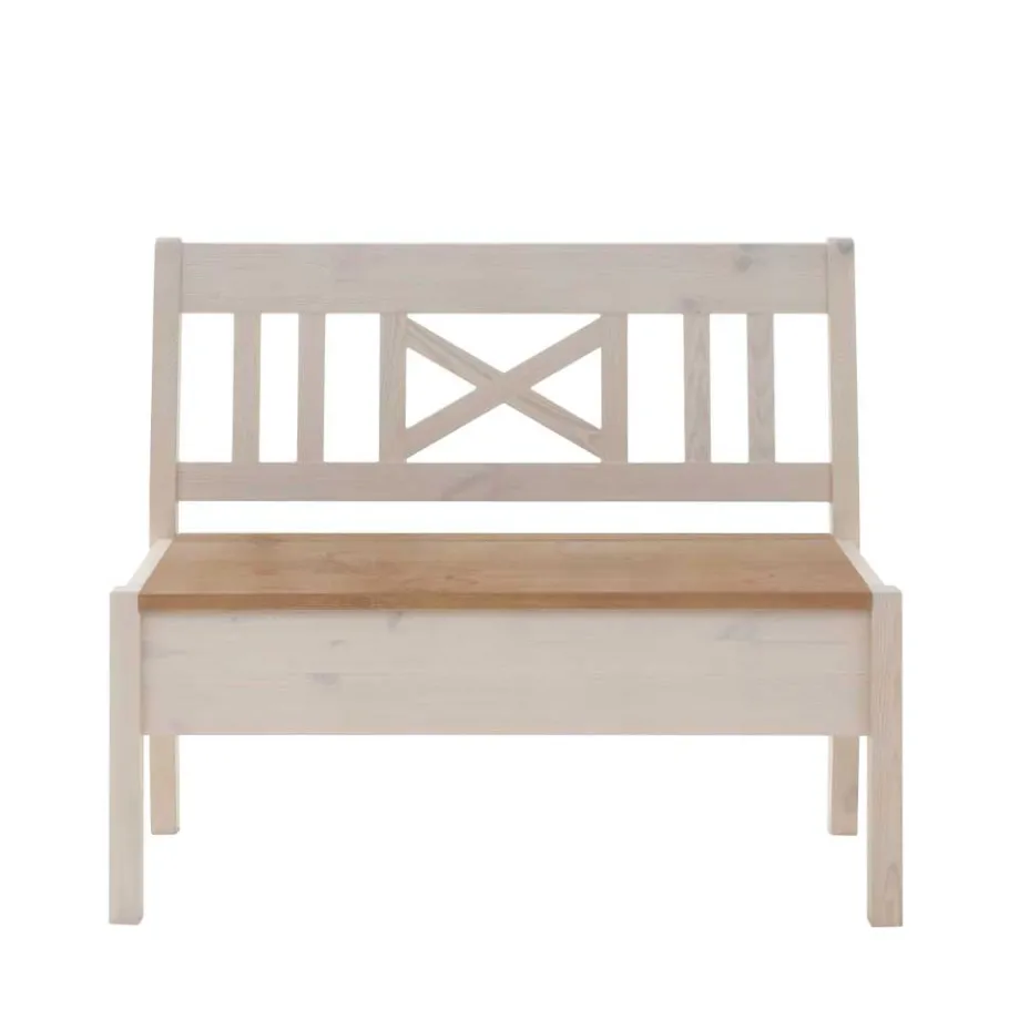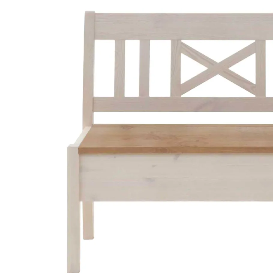 Gefertigt aus nordischem Kiefer Massivholz, präsentiert sie sich in einer harmonischen Mischung aus weiß gebeizten und lackierten Oberflächen. Die natürliche Maserung der Kiefer schimmert subtil hindurch und verleiht dem Möbelstück Charakter. Ein Teil der Bank ist zusätzlich in Laugenfarbig gebeizt und geölt, um den rustikalen Charme zu betonen.