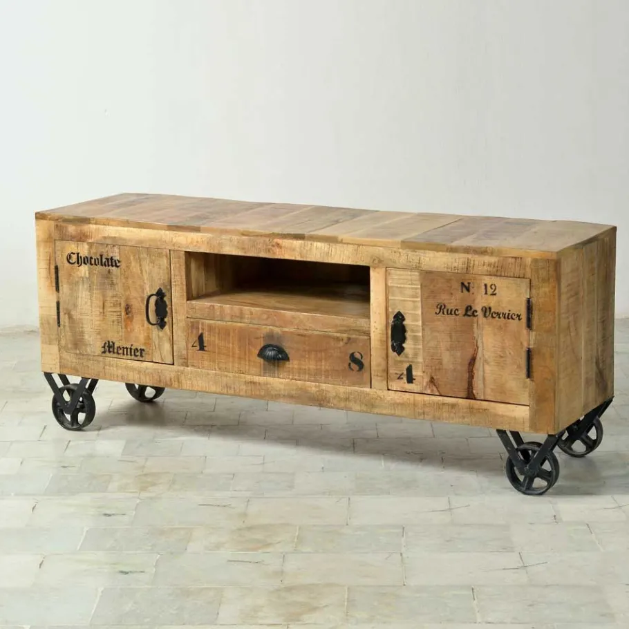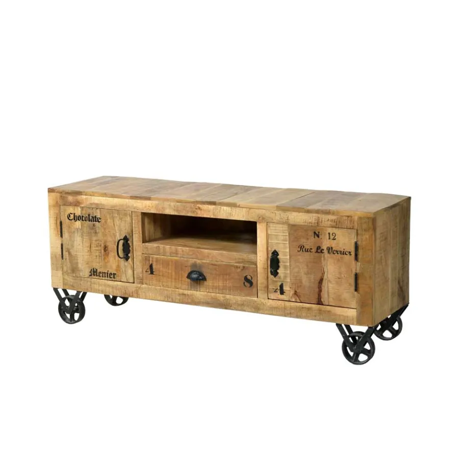 Die Rollen und Griffe aus Metall in Vintage-Schwarz setzen einen spannenden Kontrast zum warmen Mangoholz und unterstreichen den Industry-Look.