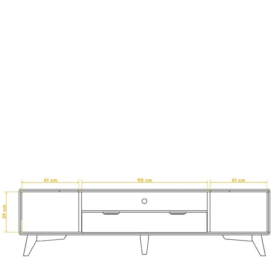 Ein weiteres Highlight des „Junola I“ TV-Lowboards ist das dekorativ abgeschrägte Vierfußgestell, das von einem zusätzlichen Stützfuß ergänzt wird. Dieses Detail verleiht dem Möbelstück eine leichte, schwebende Optik, ohne dabei auf Stabilität zu verzichten.