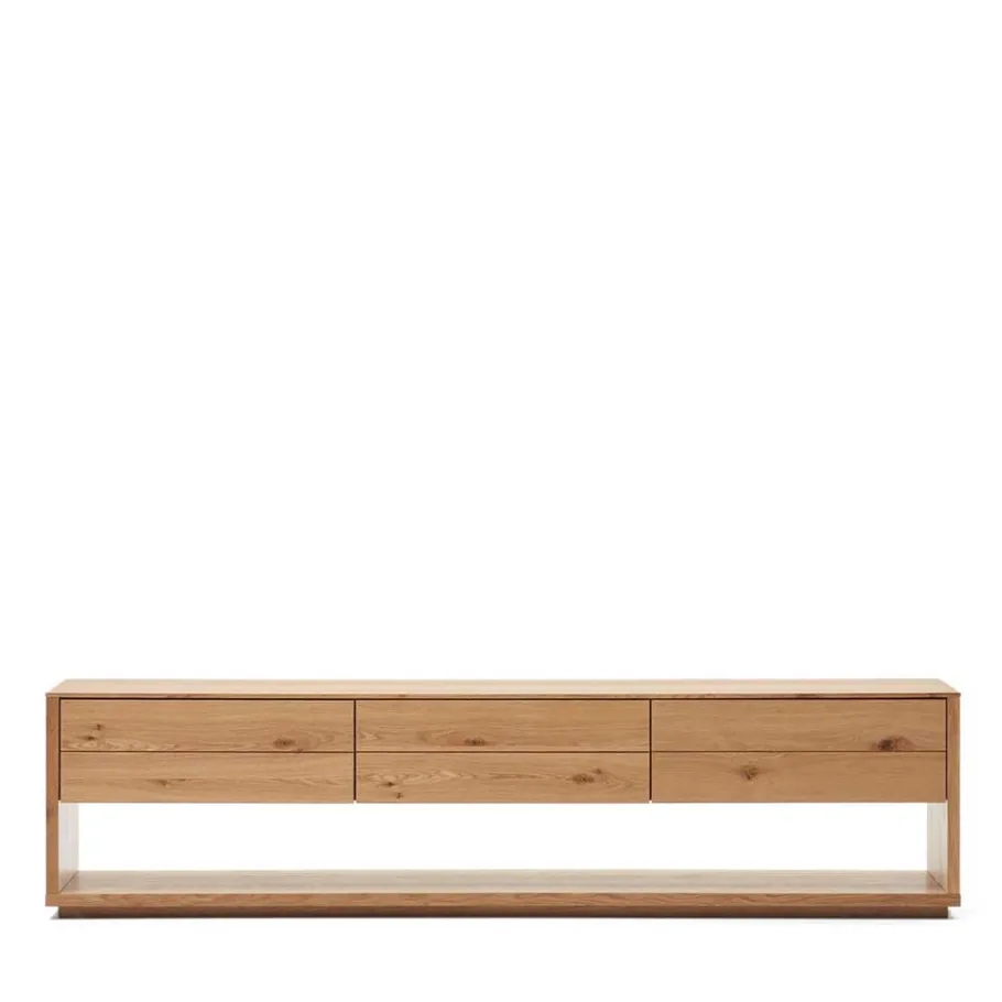 Das Lowboard „Algaro“ verfügt über eine grifflose Front mit einer innovativen push-to-open Funktion. Diese ermöglicht es Ihnen, die Schubladen durch leichtes Drücken zu öffnen, was den Bedienkomfort erhöht und gleichzeitig das Design schlank und elegant hält. Das zurückgesetzte Sockelgestell sorgt nicht nur für einen stabilen Stand, sondern verleiht dem Möbelstück auch eine schwebende Optik, die den Raum optisch größer erscheinen lässt.