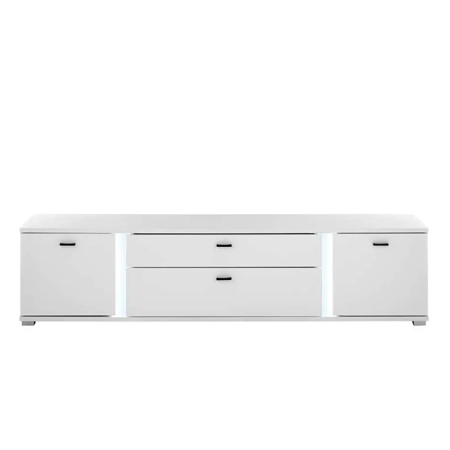 - Das TV Board (200x45x42 cm): Perfekt geeignet für große Fernseher bis zu einer Größe von 75 Zoll. Hinter den Türen verbergen sich geräumige Staufächer, während zwei Soft-Close-Schubladen mit Metallauszug zusätzlichen Platz für Mediengeräte, DVDs oder Fernbedienungen schaffen.