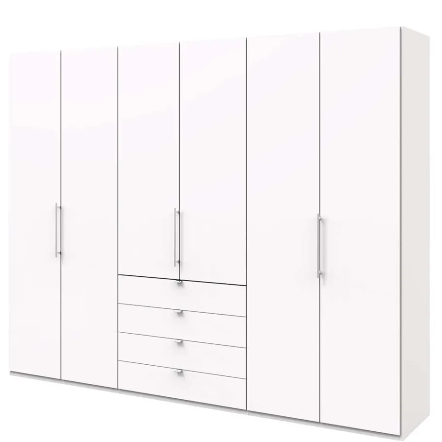 Mit seinen beeindruckenden Maßen von 300 cm in der Breite und 236 cm in der Höhe bietet der Schrank „Donpiave“ großzügigen Stauraum für all Ihre Kleidung und Accessoires. Die Besonderheit liegt in den drei Panorama-Falttüren, die in der Sechs-Türen-Optik gestaltet sind und nach vorne gezogen werden. Diese innovative Lösung spart nicht nur Platz, sondern ermöglicht auch einen komfortablen Zugriff auf Ihre Garderobe. Hinter den Türen erwarten Sie drei Fachelemente, jeweils ausgestattet mit zwei Einlegeböden und einer robusten Metall-Kleiderstange – perfekt organisiert und stets griffbereit.