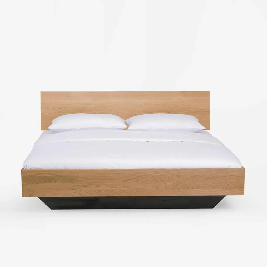 Der Rahmen und das schlichte, senkrecht verlaufende Kopfteil des Bettes sind honigfarben geölt. Diese natürliche Oberflächenbehandlung unterstreicht nicht nur die Schönheit des Wildeichenholzes, sondern bietet auch zahlreiche praktische Vorteile: Die Ölung schützt das Holz, bewahrt seine Atmungsaktivität und sorgt für ein angenehmes Raumklima. Gleichzeitig unterstützt die geölte Oberfläche das warme, natürliche Ambiente Ihres Schlafzimmers und fördert Ihr Wohlbefinden.