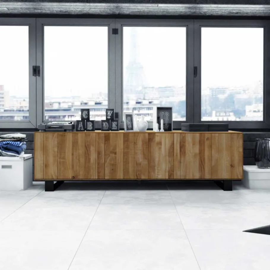 Das Lowboard wird von einem robusten Bügelgestell aus schwarzem, gebürstetem Stahl getragen. Dies verleiht dem Möbelstück einen modernen Touch und sorgt für Stabilität und Langlebigkeit.