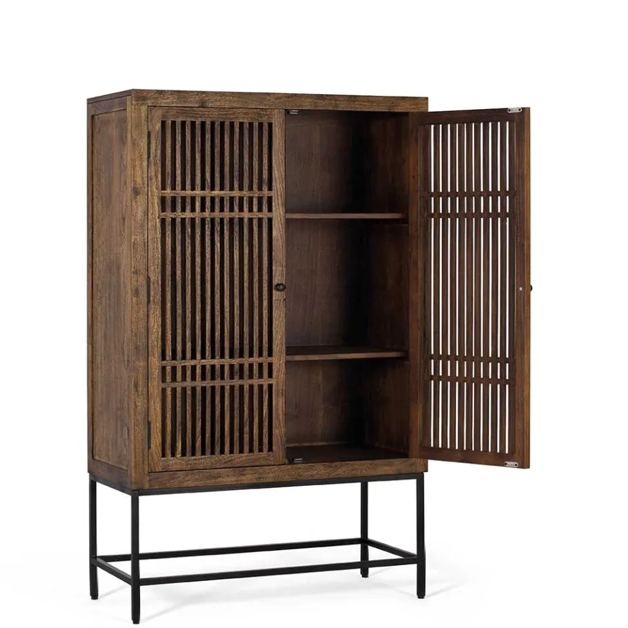 Der „Charin“ Schrank ist nicht nur ein optisches Highlight, sondern auch funktional durchdacht. Hinter den zwei Türen, die mit robusten Metallscharnieren ausgestattet sind, finden Sie zwei Einlegeböden, die ausreichend Platz für Ihre Lieblingsstücke bieten. Ob Bücher, Dekoration oder andere Wohnaccessoires – dieser Schrank bietet Ihnen genug Stauraum, um Ihr Wohnzimmer ordentlich und stilvoll zu gestalten. Der hohe Metallrahmen sorgt für einen modernen Look und ermöglicht gleichzeitig eine gute Luftzirkulation im Inneren des Schranks.