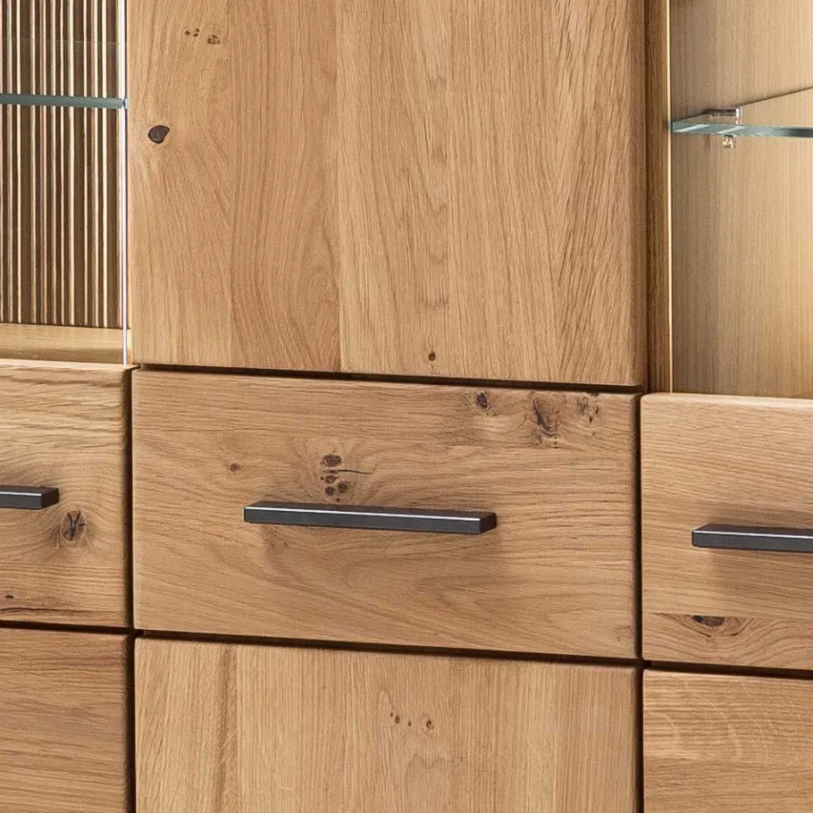 Die sichtbare Rückwand hinter den Fächern mit Glaseinsatz sind aus massivem Eichenholz versehen. Dieser beeindruckt mit plastisch geriffelter Struktur und verleiht dem Highboard eine außergewöhnliche Note. Für eine noch edlere Präsentation Ihrer Ausstellungsstücke können Sie für diese Fächer optional eine effiziente LED-Beleuchtung bestellen.