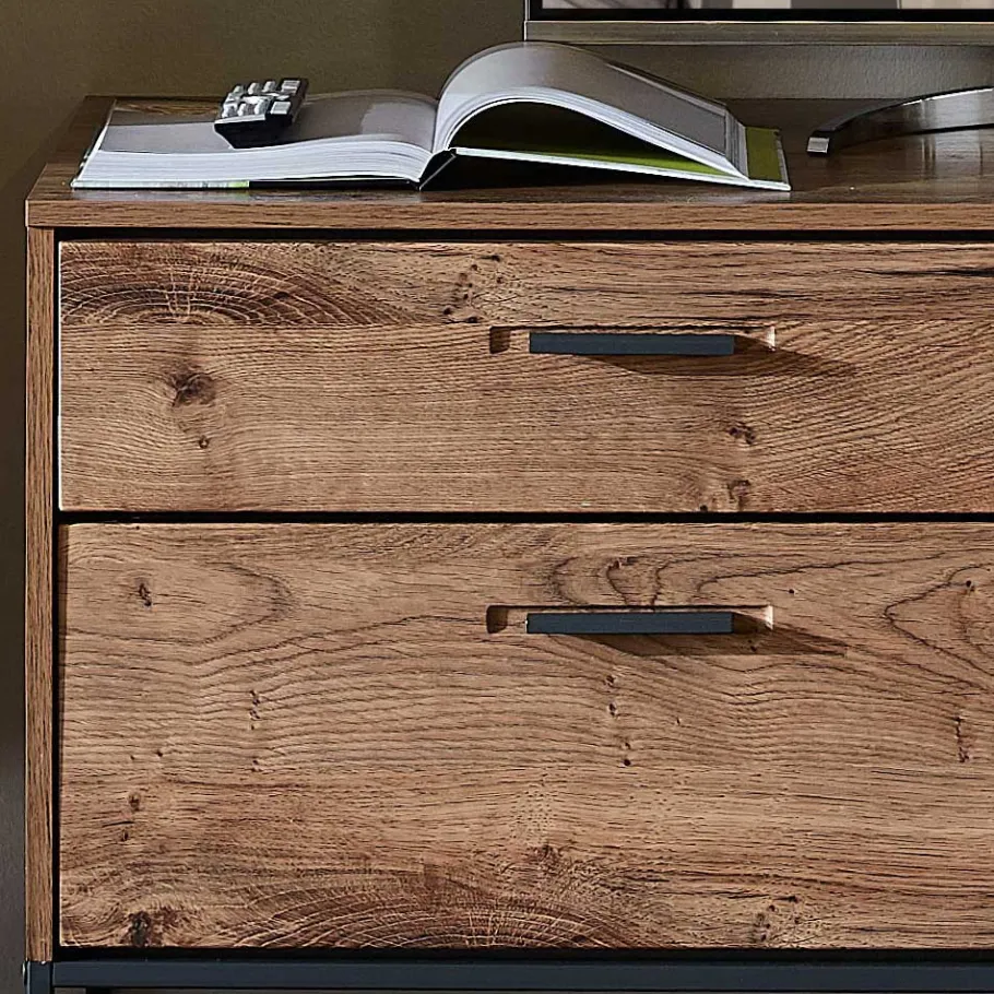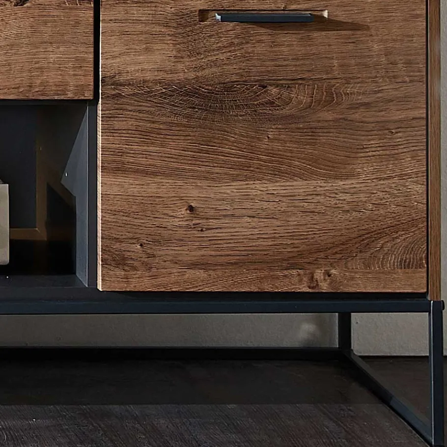 Rechts am Lowboard befindet sich eine Tür mit Softclose-Funktion, hinter der ein Einlegeboden für weiteren Stauraum sorgt. Dieser ist bis zu 5 kg belastbar. Metall-Griffleisten an Schubladen und Tür verleihen dem Möbelstück einen zusätzlichen industriellen Charme.