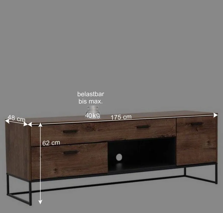 Mit seinen Abmessungen von 175 cm Breite, 62 cm Höhe und 48 cm Tiefe bietet das TV-Lowboard „Xindus“ viel Platz für Ihr TV-Zubehör. Der Oberboden ist bis zu 40 kg belastbar und kann daher auch große Fernseher problemlos tragen. Unterhalb des Oberbodens befinden sich eine breite und eine kleinere Schublade, beide mit einer Doppelzarge ausgestattet und mit Metallauszug, der eine Softclose- und Selbsteinzugsfunktion bietet.