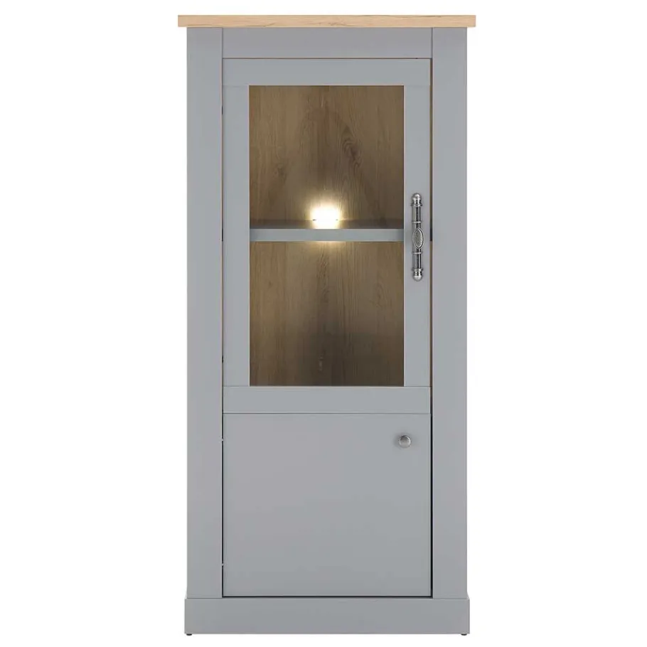 - Harmonische Standvitrine in Lichtgrau und Eichefarben