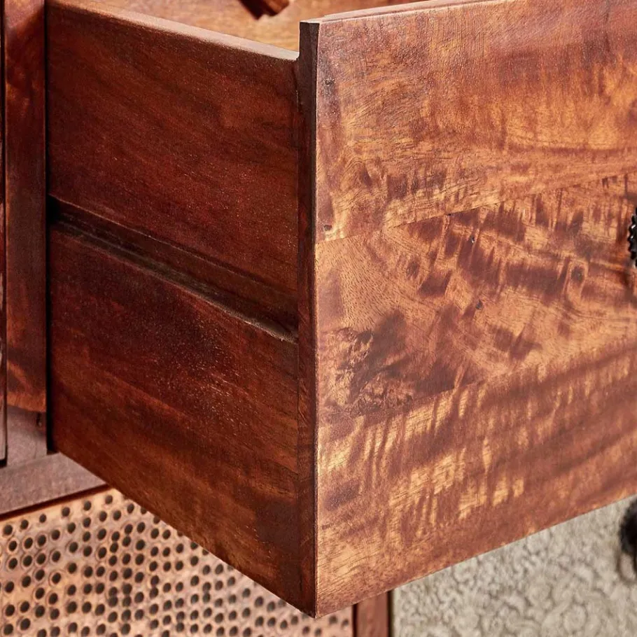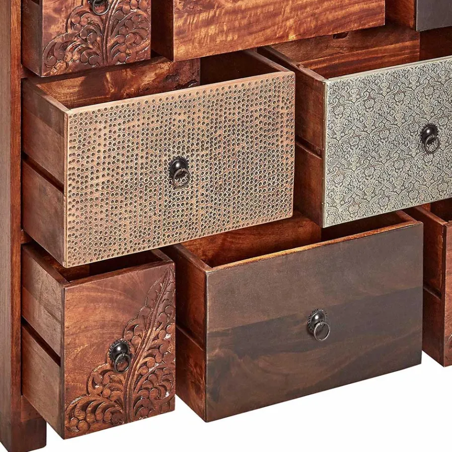 Mit insgesamt acht Schubladen bietet Ihnen die „Welina“ ausreichend Stauraum für all Ihre persönlichen Gegenstände. Die unterschiedlichen Größen der Schubladen ermöglichen eine vielseitige Nutzung, während die rustikalen Metall-Ringgriffe in Silberfarben einen charmanten Kontrast zum Holz bieten.