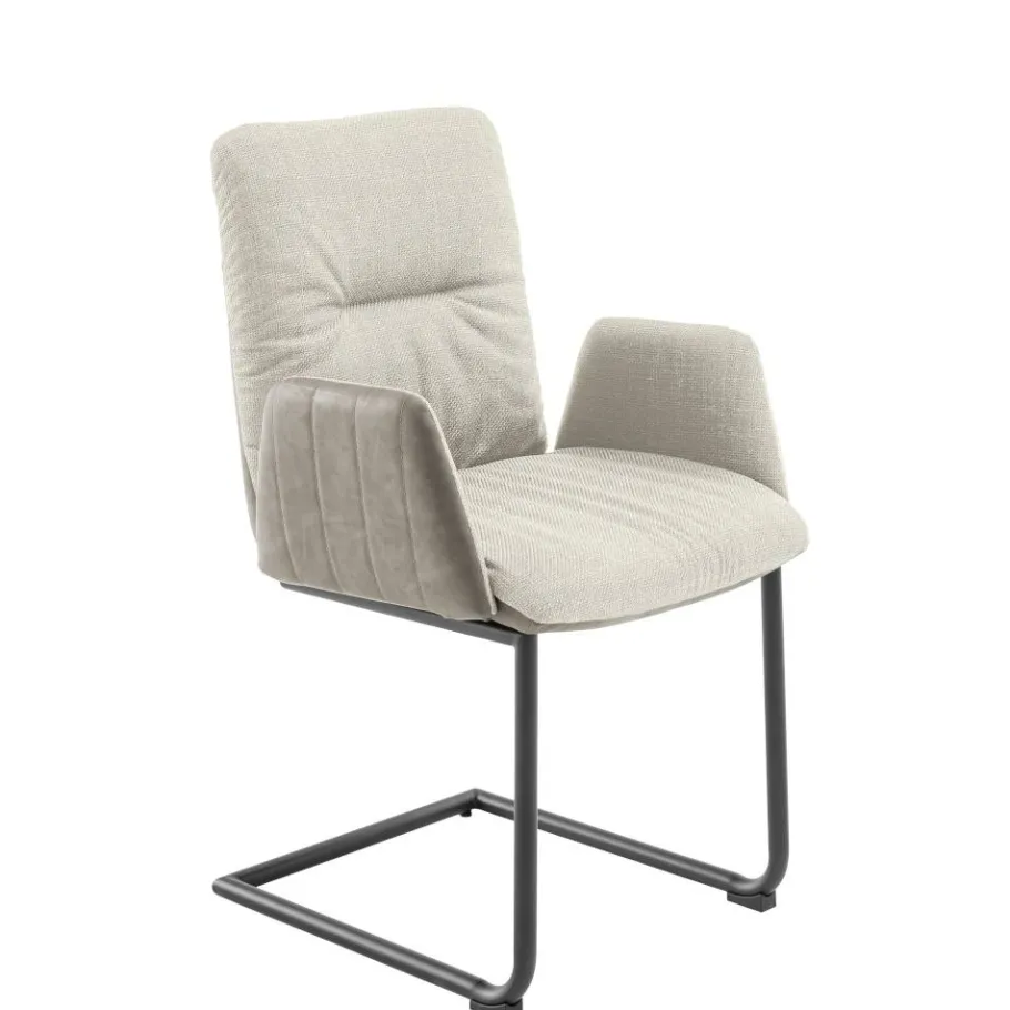 Der Armlehnen-Freischwingerstuhl „Clebertus“ bringt mit seiner harmonischen Farbgebung in Creme und Schwarz eine entspannte Atmosphäre in Ihr Zuhause. Mit seiner lässigen Kissenoptik, dekorativen Stepp- und Ziernähten sowie der leicht nach hinten geneigten Rückenlehne lädt er dazu ein, den Alltag hinter sich zu lassen und den Moment zu genießen – ob am Esstisch, im Homeoffice oder als stilvolles Highlight im Besprechungsraum.