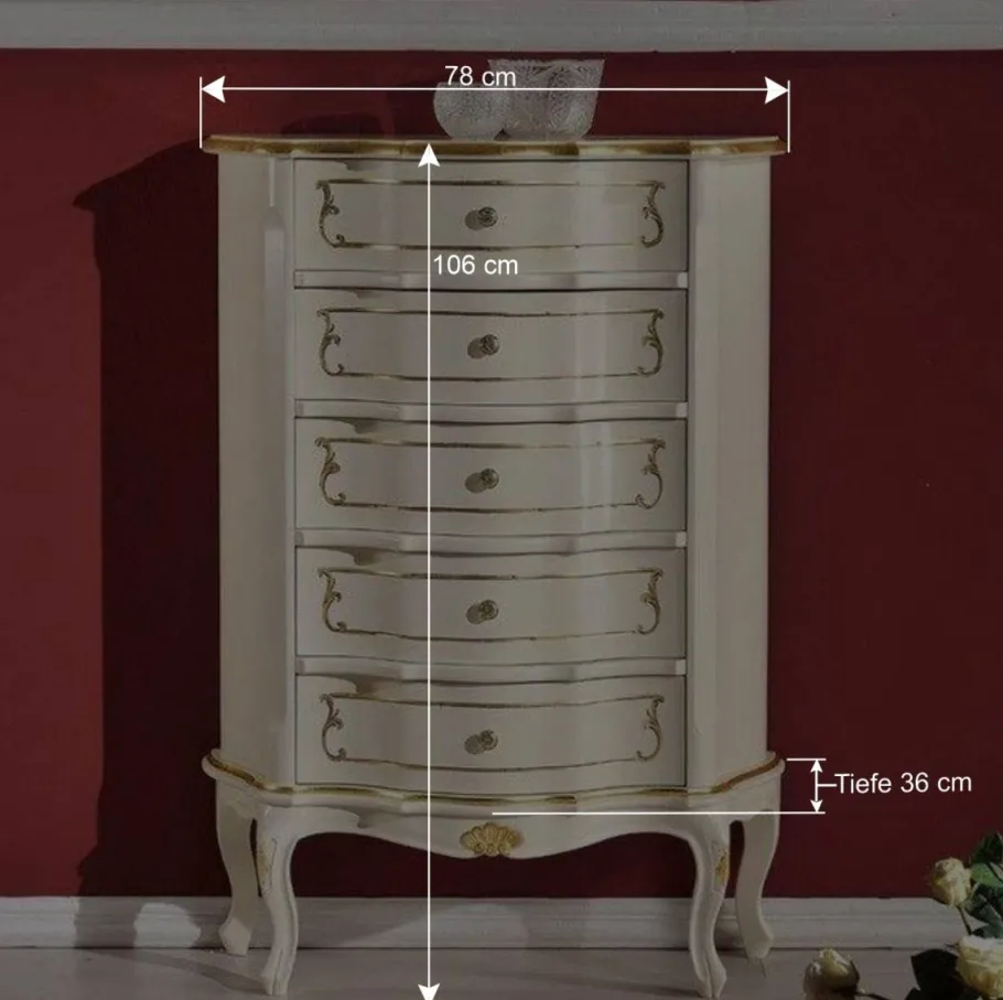 Tauchen Sie ein in die opulente Ära des Barocks mit unserer Hochkommode „Datalera“. Mit ihren zauberhaft floralen Motiven und aufwändig gefrästen Kanten vermittelt sie eine exklusive und majestätische Atmosphäre, die in jedem Wohnraum für einen echten Blickfang sorgt.