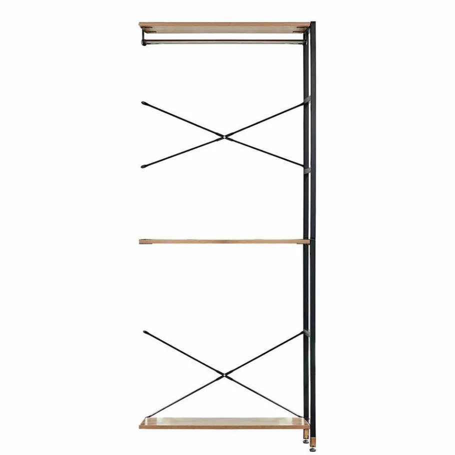 Zwei kleine Regalelemente mit jeweils fünf Einlegeböden bieten viele Möglichkeiten zur individuellen Gestaltung und Organisation. Die offene Rückwand mit Metall X-Streben unterstreicht das offene, luftige Design und bietet gleichzeitig zusätzliche Stabilität.