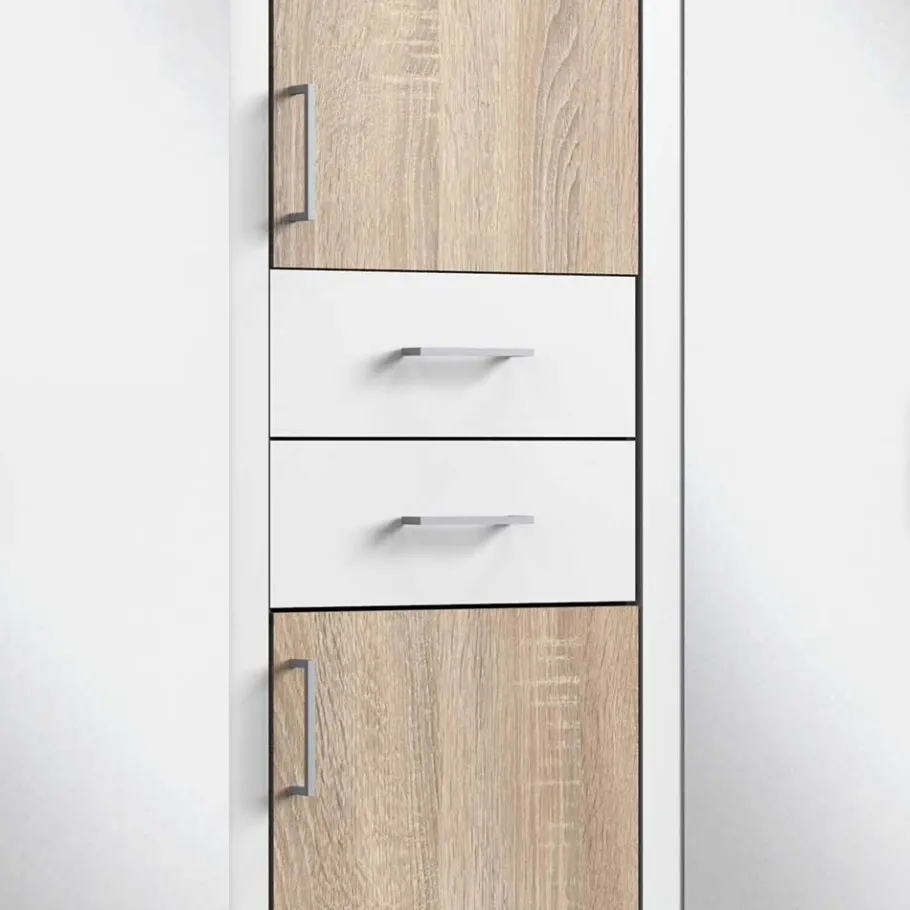 Die Oberflächen des Kleiderschranks sind in Weiß und in einer ansprechenden Holzoptik Eiche Sägerau foliert. Diese hochwertige Folierung bietet zahlreiche Vorteile: Sie ist äußerst pflegeleicht und kann mühelos mit einem feuchten Tuch gereinigt werden. Zudem schützt sie die darunterliegende Spanplatte vor äußeren Einflüssen und verleiht dem Schrank eine edle und moderne Optik. Der gelungene Farbkontrast zwischen Weiß und Eiche sorgt dabei für ein harmonisches und stilvolles Gesamtbild.
