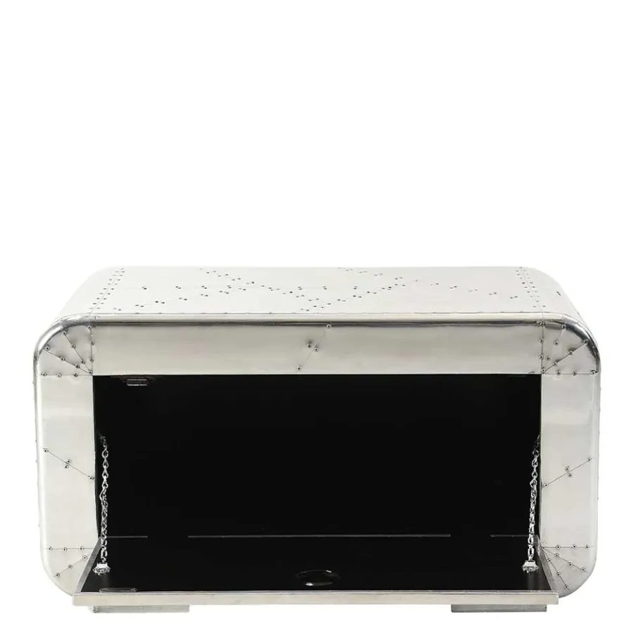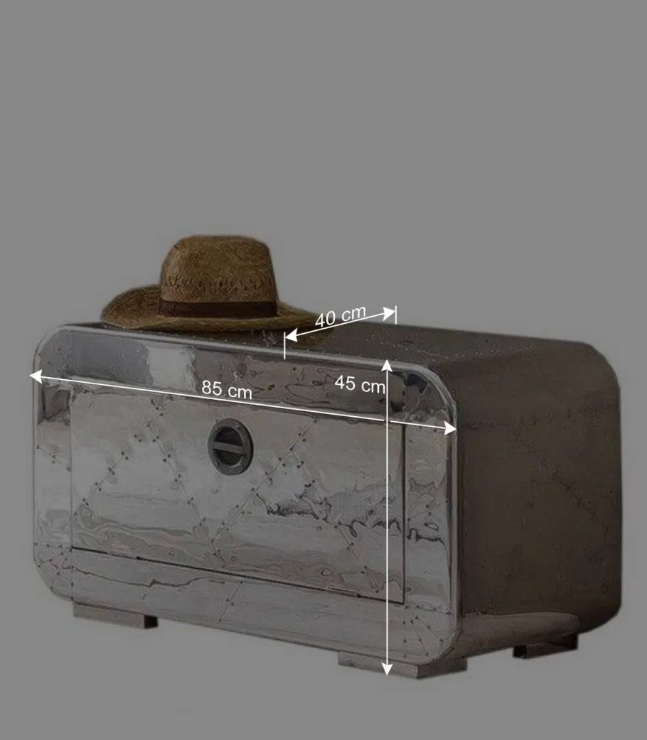 Die Oberfläche des Schuhschranks „Pilot“ ist komplett mit Aluminium beschlagen und mit auffälligen Zierschrauben versehen – eine Hommage an den klassischen Flugzeugbau, die das Herz jedes Designliebhabers höherschlagen lässt. Der nicht mit Aluminium verkleidete Rücken sorgt dabei für eine angenehme Balance und Authentizität.