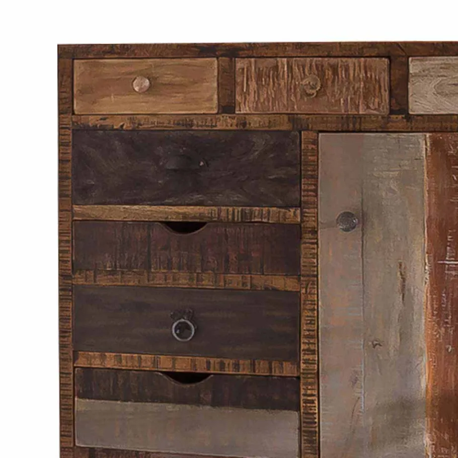 Die Kommode ist vollständig aus recyceltem Mangobaumholz gefertigt, welches für seine beeindruckende Strapazierfähigkeit und einzigartige Maserung bekannt ist. Dieses umweltfreundliche Holz bringt nicht nur Wärme und Charakter in Ihr Heim, sondern unterstützt auch nachhaltige Forstwirtschaft. Kombiniert mit einem stabilen Metallbügelgestell in Schwarzgrau, bietet „Bahiro“ eine herausragende Qualität und Langlebigkeit. Die lackierten, rauen Holzoberflächen in Antikfinish unterstreichen den charakteristischen Charme dieses Möbelstücks, während die Lackierung zusätzlich Schutz vor Abnutzung bietet und die Reinigung erleichtert.