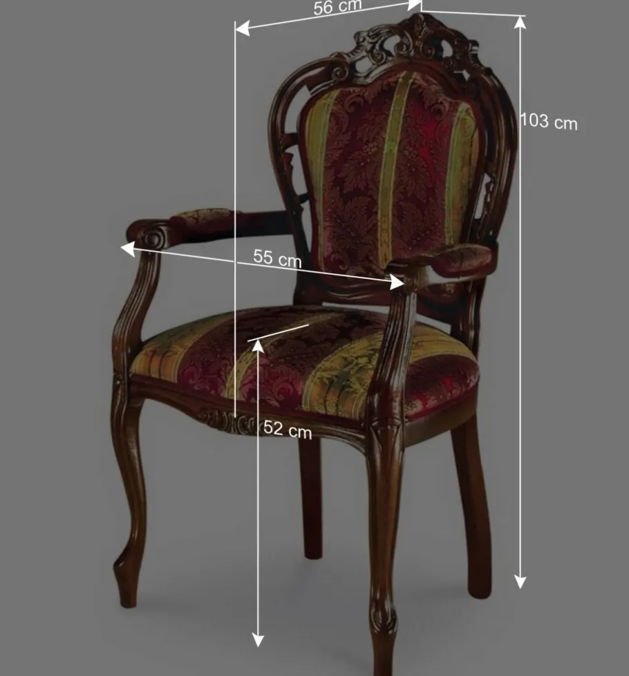 Jedes Detail am „Magari“ spricht für die handwerkliche Kunstfertigkeit: Von der weich gepolsterten, königlichen Rückenlehne, umrahmt von einem reich beschnitzten Massivholzrahmen, bis hin zu den bequemen Armlehnen mit kleiner Polsterauflage. Das kunstvoll verzierte Vierfußgestell in leicht gebogener Form verleiht dem Stuhl zusätzliche Stabilität und einen Hauch von Anmut.