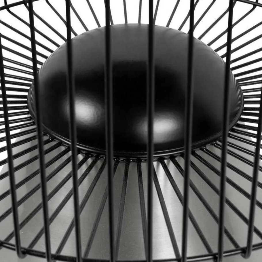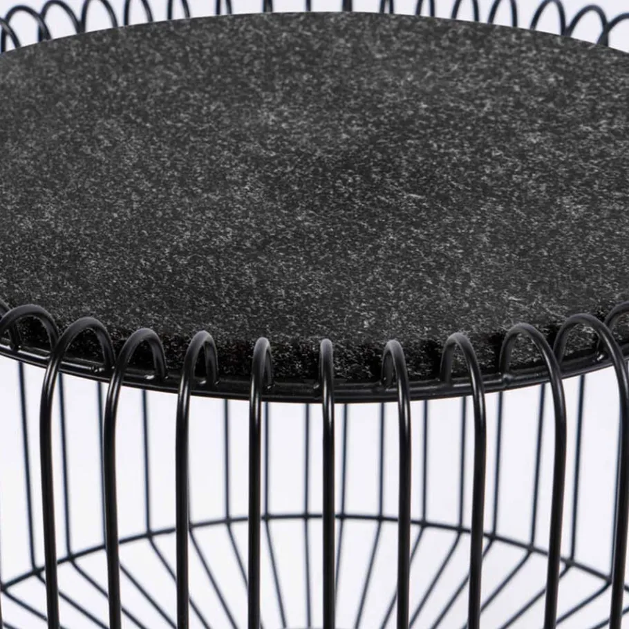 Gefertigt aus einer spannenden Materialmischung, vereint der Beistelltisch edlen Marmor mit stabilem Metall. Die runde Tischplatte besteht aus schwarzem Marmor – einem Naturstein, der mit seiner individuellen Maserung jedes Möbelstück zum Unikat macht. Mit einem Durchmesser von ca. 40 cm und einer Stärke von rund 1,5 cm wirkt die Platte gleichermaßen robust wie edel. Das Untergestell zeigt sich als auffälliger Drahtkorpus in Schwarz, getragen von einem soliden Sockel in Silber. Beide Elemente sind hochwertig lackiert und unterstreichen das avantgardistische Design.