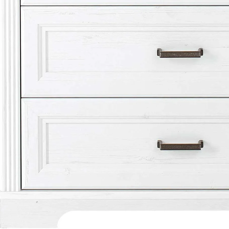 Gefertigt aus robustem Holzwerkstoff, bietet die Kommode eine solide Basis für Ihren Alltag. Die Front besteht aus hochwertigem MDF (mitteldichte Faserplatte), bekannt für seine hohe Stabilität und glatte Oberfläche, die sich hervorragend für anspruchsvolle Designs eignet. Der Korpus aus Spanplatte sorgt für ein geringeres Gewicht und eine einfachere Handhabung. Beide Oberflächen sind in einer pflegeleichten Holzoptik Pinie Weiß und Eiche foliert. Diese spezielle Folierung schützt das Material vor Kratzern und Feuchtigkeit, was die Langlebigkeit des Möbelstücks zusätzlich erhöht.