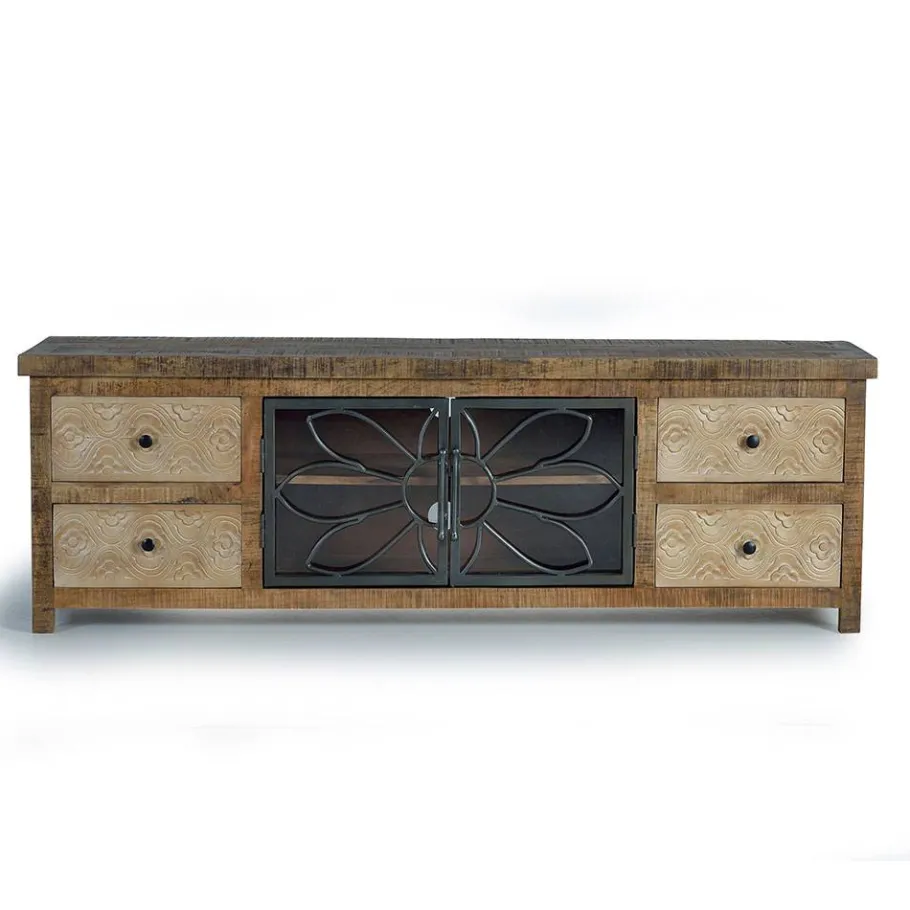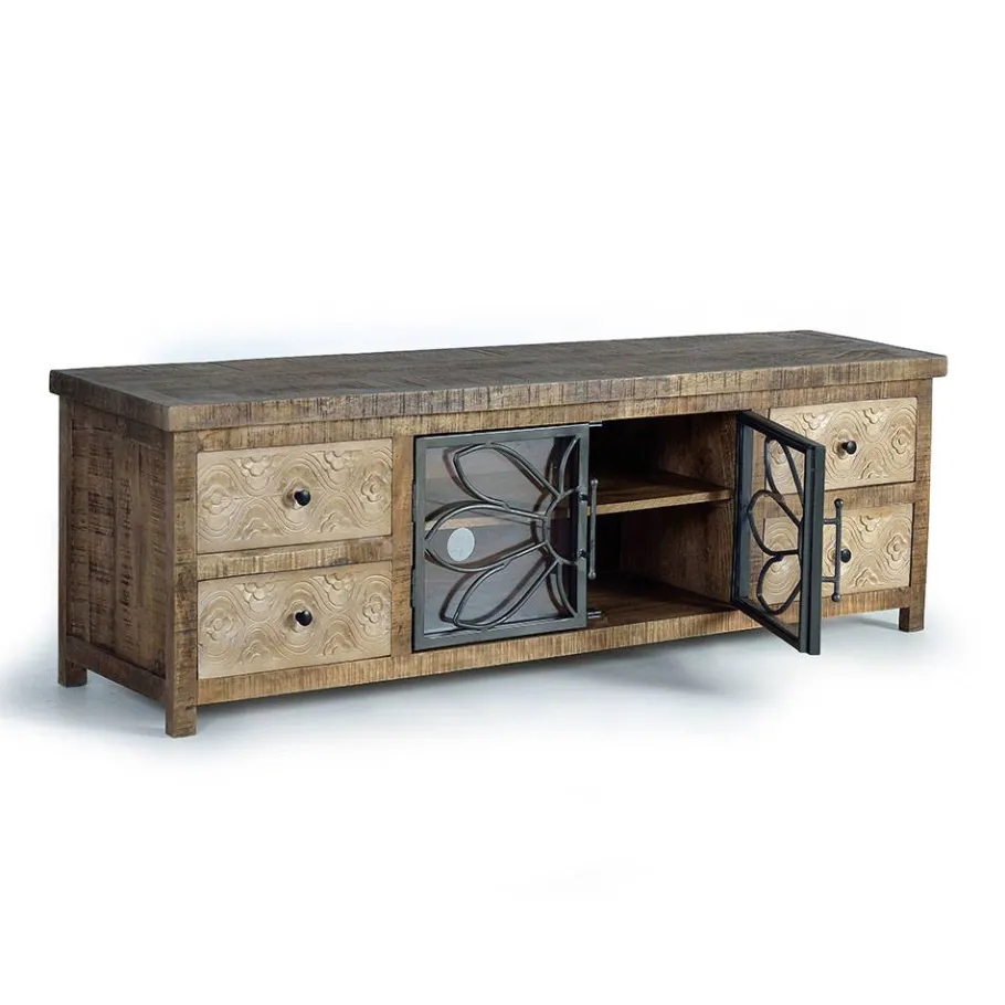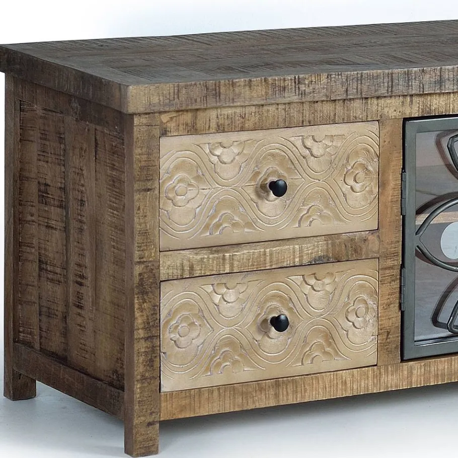 Das Lowboard beeindruckt nicht nur durch sein Design, sondern auch durch seine Funktionalität. Mit vier geräumigen Schubladen – je zwei auf der linken und rechten Seite – bietet es viel Platz für Ihre Utensilien. Die Schubladenfronten sind mit aufwendigen Schnitzereien verziert, die das Möbelstück zu einem echten Blickfang machen. In der Mitte befinden sich zwei Glastüren mit Metallrahmen und dekorativen Ornamenten. Dahinter verbirgt sich ein Einlegeboden, der zusätzlichen Stauraum für Bücher, Geschirr oder Dekorationsobjekte schafft. Die Kombination aus Stangengriffen an den Türen und Knopfgriffen an den Schubladen macht die Handhabung besonders komfortabel.