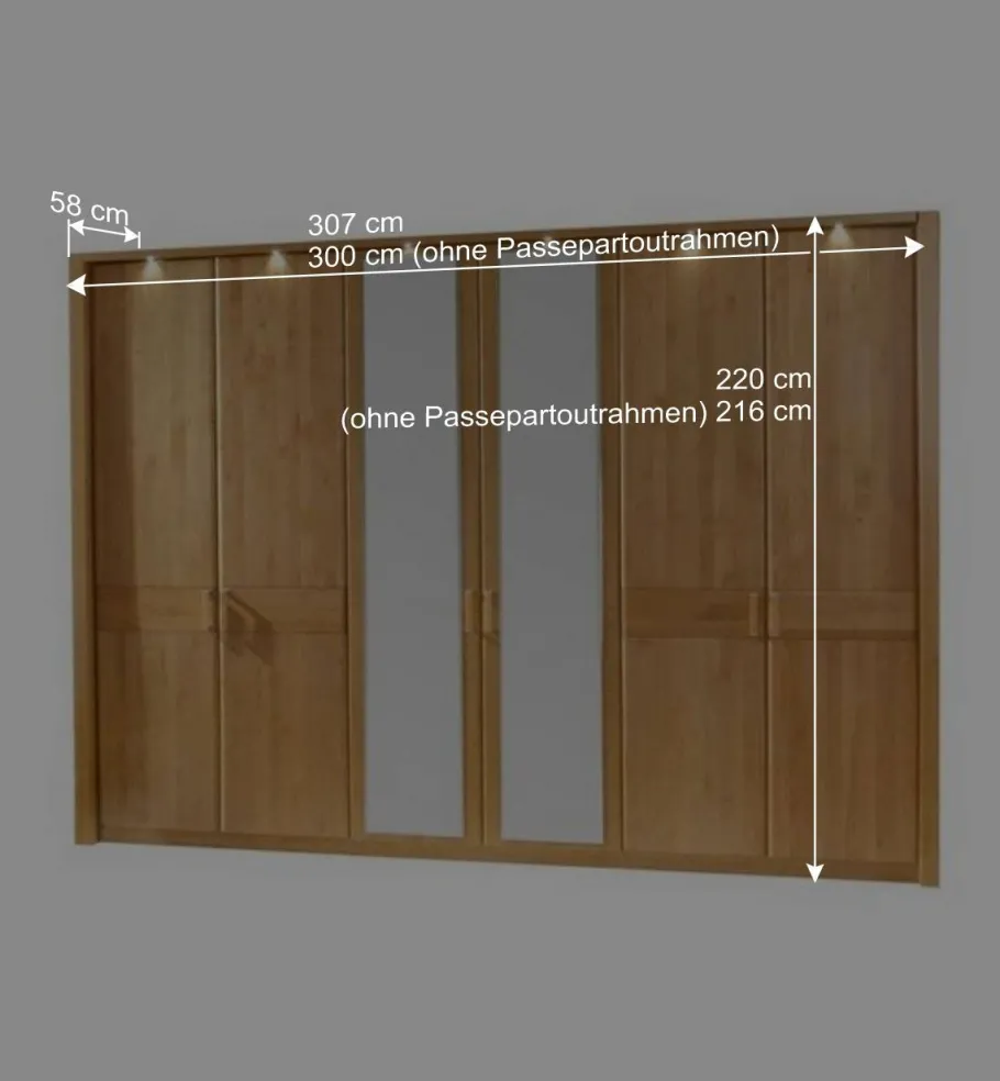 Mit seinen beeindruckenden Maßen von 300 cm Breite, 58 cm Tiefe und 216 cm Höhe bietet der Kleiderschrank „Bordeaux“ viel Stauraum für Ihre Garderobe und Accessoires. Optional können Sie sich für den Passepartout-Rahmen entscheiden, der mit integrierten Power-LEDs für eine stimmungsvolle Beleuchtung sorgt und die Maße auf 307 cm Breite und 220 cm Höhe erweitert. Sechs Drehtüren öffnen sich zu einem großzügigen Innenraum, in dem sich drei Facheinheiten mit je zwei Einlegeböden und einer Metallkleiderstange befinden.