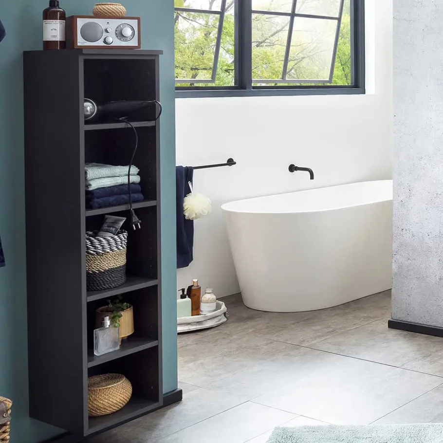 Mit einer Breite von 30 cm, einer Höhe von 135 cm und einer Tiefe von 35 cm nutzt dieses Regal auch schmale Wandbereiche optimal aus. Fünf offene Fächer durch vier in der Höhe verstellbare Einlegeböden bieten Ihnen reichlich Stauraum für Handtücher, Kosmetikprodukte oder dekorative Accessoires. Ganz gleich, ob Sie Ordnung schaffen oder gezielt Akzente setzen möchten – dieses Möbelstück lässt Ihnen alle Freiheiten.