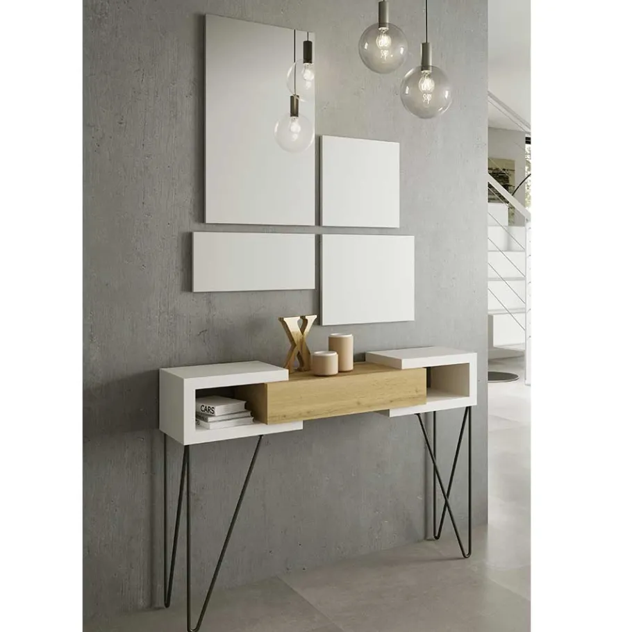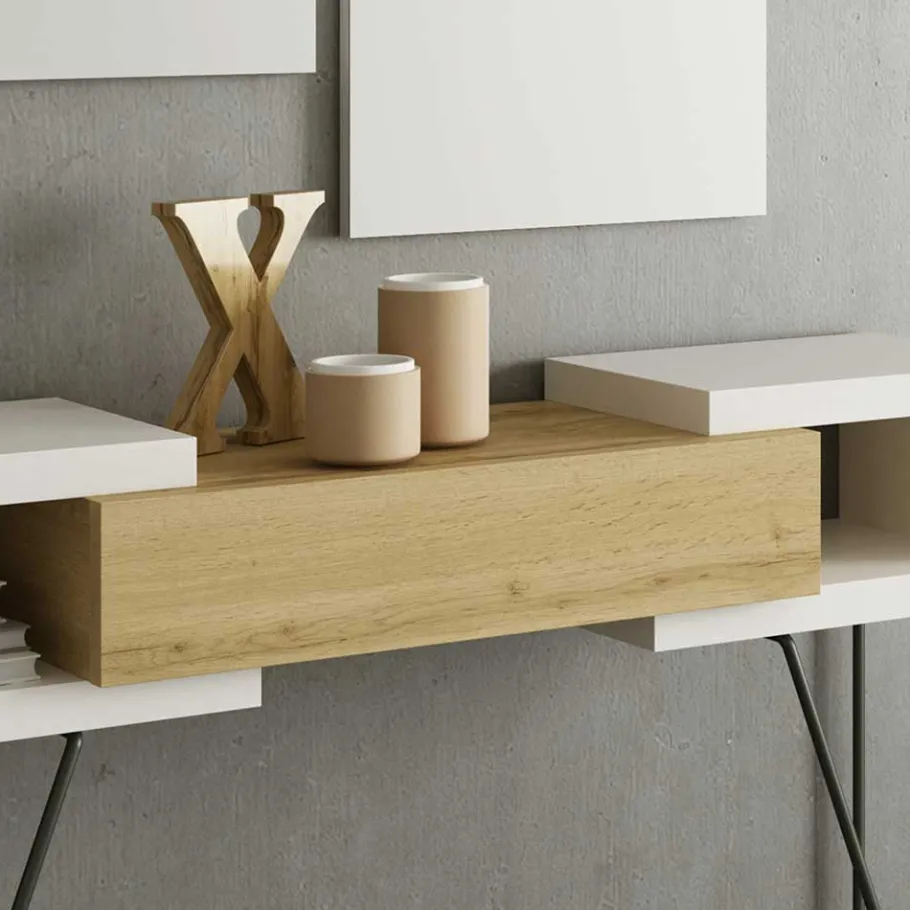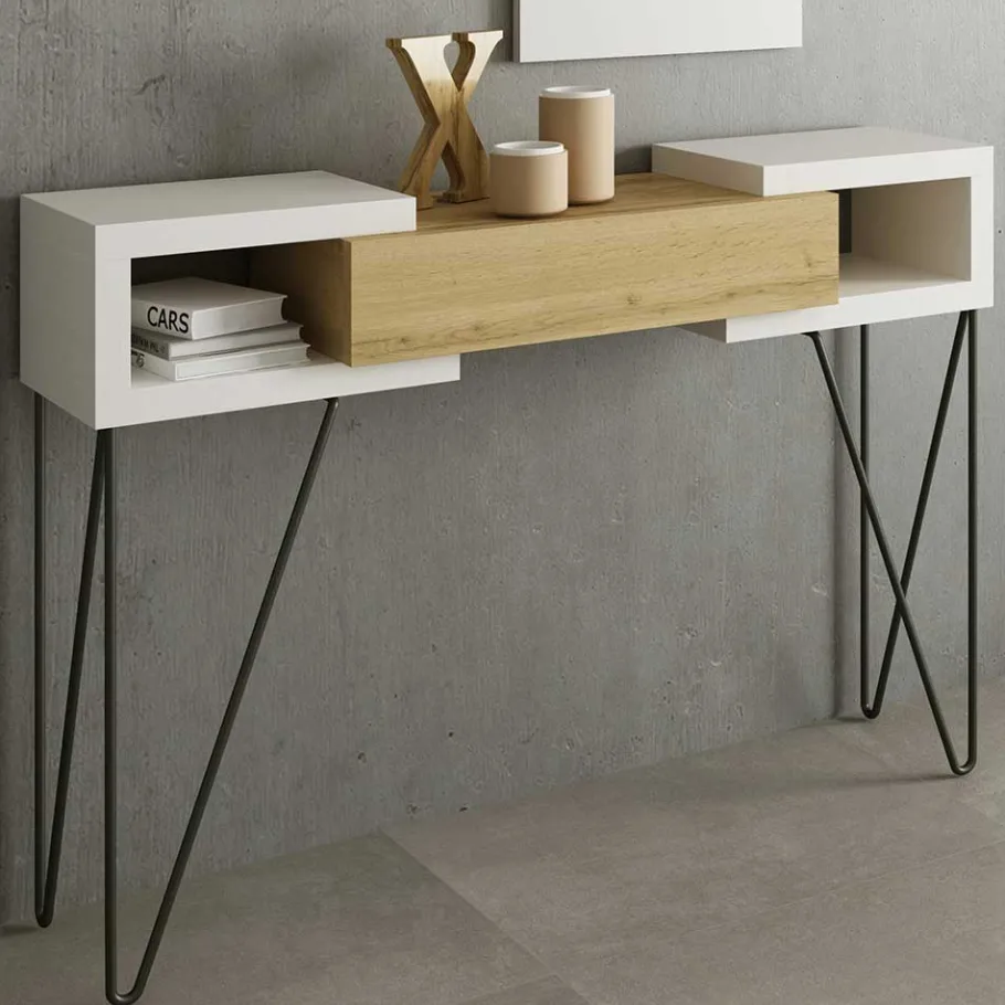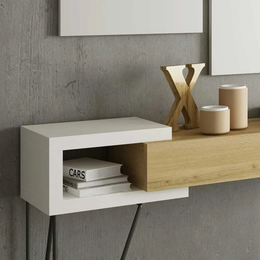 - Melaminbeschichtete Oberfläche in Holzoptik Weiß und Holzoptik Wildeiche, Metall schwarz lackiert