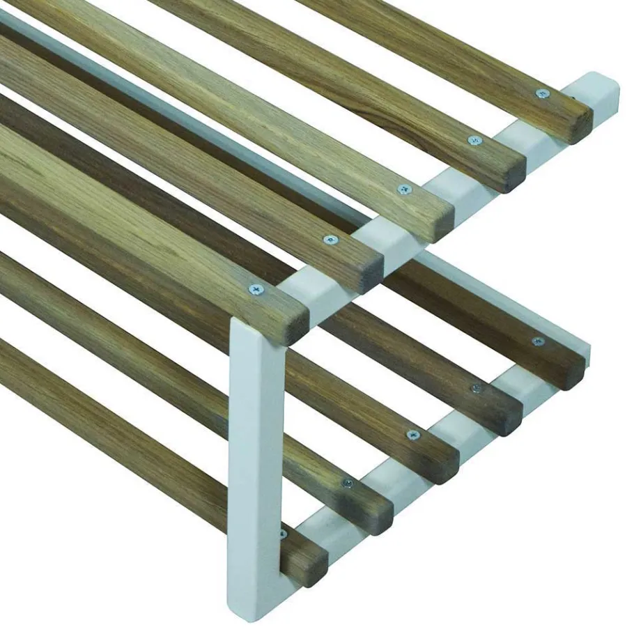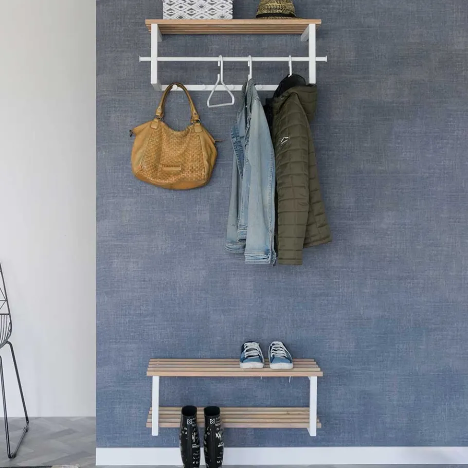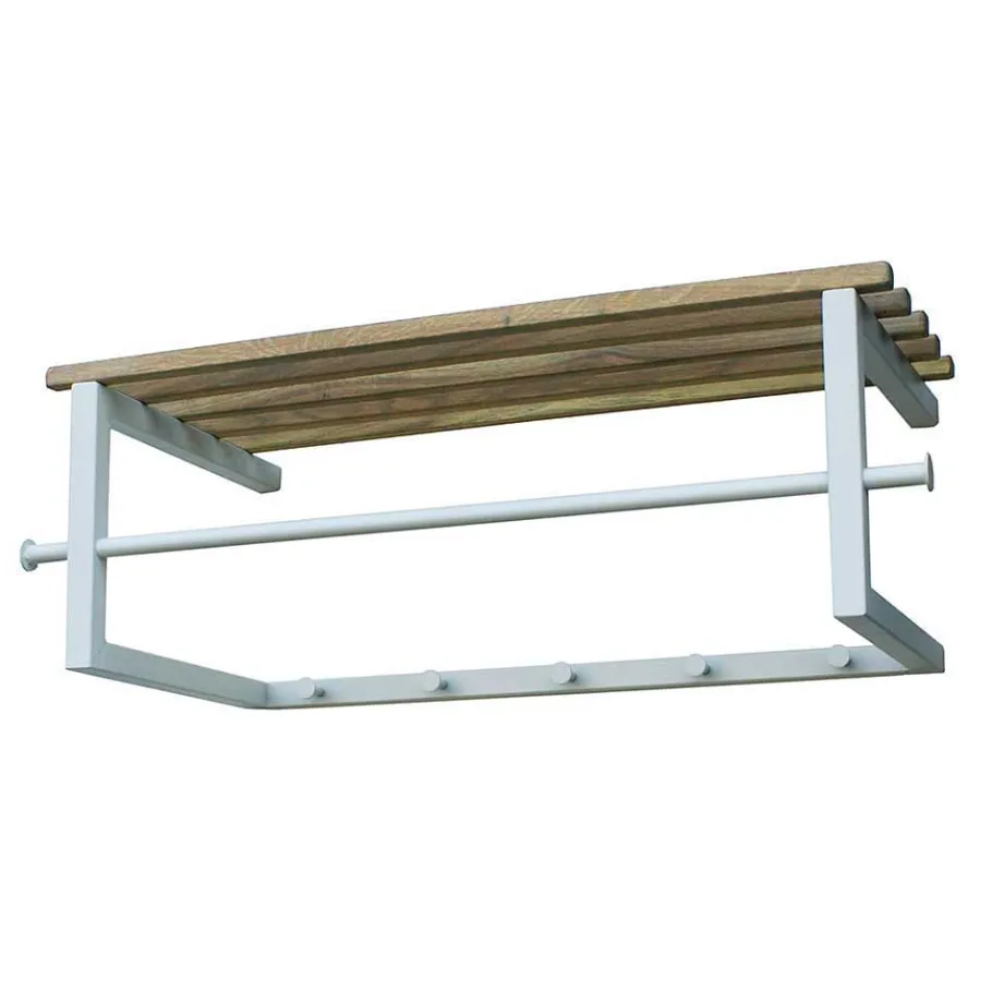 - Die Breite der Stange beträgt 76 cm, die Breite der Lamellen auf der Oberseite der Garderobe 71 cm