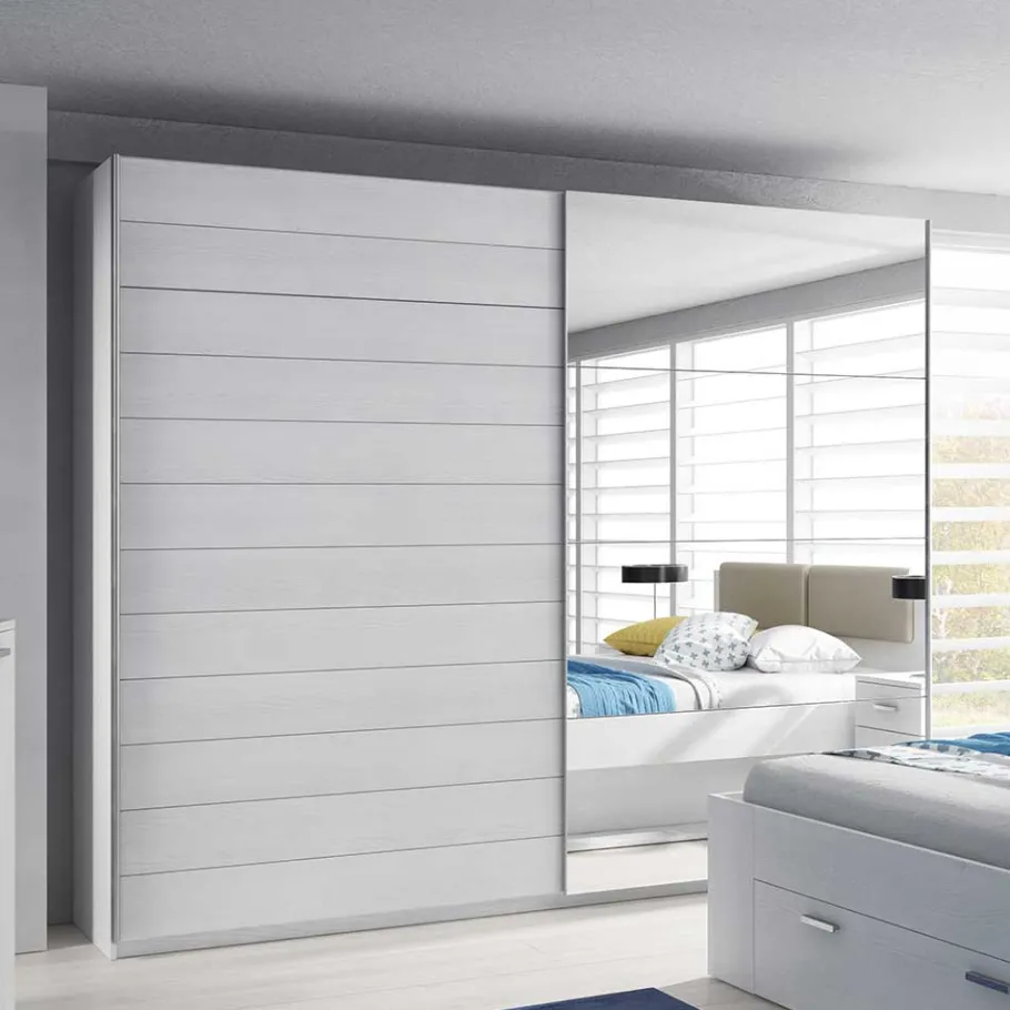 Gefertigt aus robustem Holzwerkstoff (Spanplatte) und veredelt mit Spiegelglas, bietet der Kleiderschrank „Pruducia“ zahlreiche Vorteile. Spanplatte ist nicht nur langlebig und stabil, sondern auch kosteneffizient und umweltfreundlich. Die großzügige Spiegelfläche an der Front verleiht dem Raum eine optische Tiefe und lässt ihn größer und heller erscheinen. Zudem sind die Oberflächen in einer ansprechenden Holzoptik Esche weiß foliert, was dem Schrank ein edles und zeitloses Aussehen verleiht. Die Folierung schützt das Material vor Kratzern und Abnutzung, sodass Sie lange Freude an diesem Möbelstück haben werden.