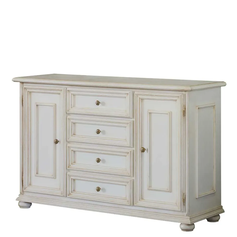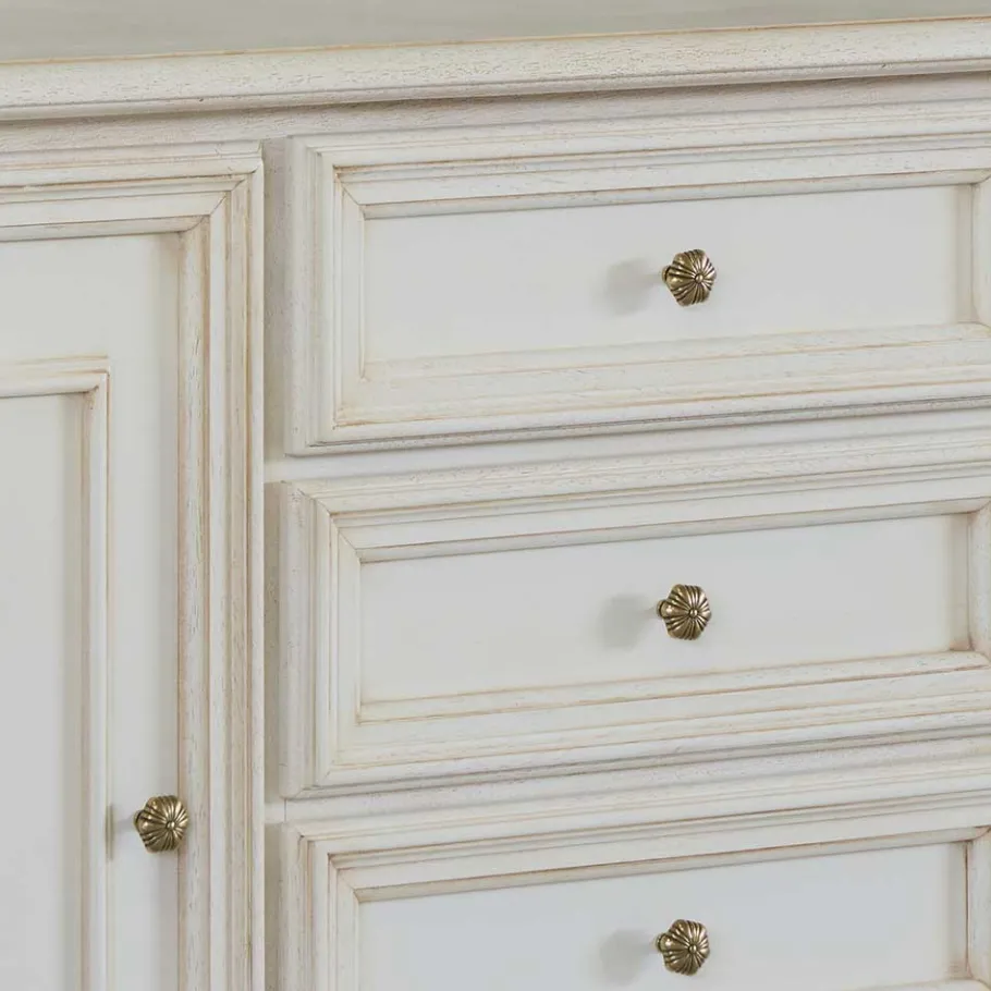 Die aufwändige Kassettenoptik und die feinen Zierfräsungen verleihen der Kombi-Kommode eine edle Ausstrahlung. Ergänzt durch goldfarbene Metall-Knopfgriffe und kunstvoll gedrechselte Holzfüße, unterstreicht jedes Detail den klassischen Stil dieses Möbelstücks.