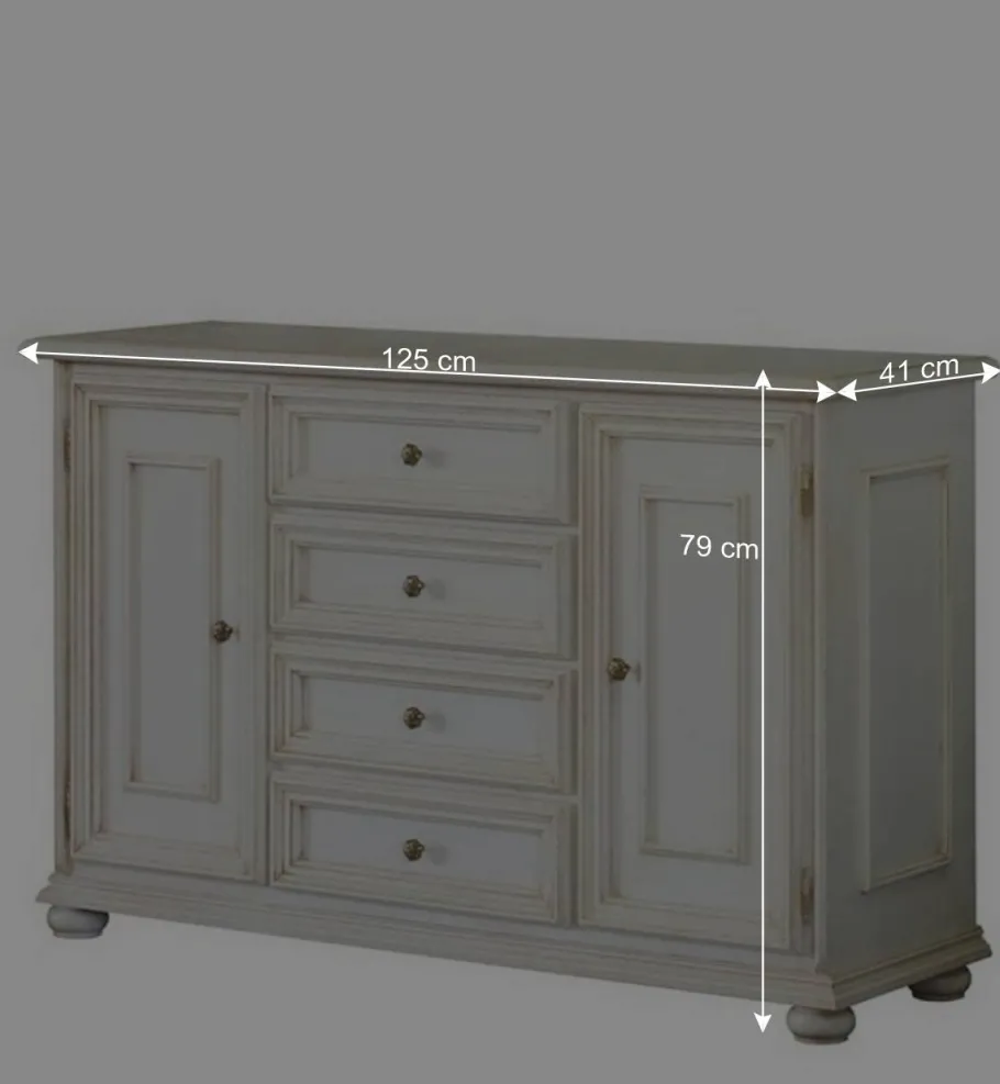 Mit einer Breite von 125 cm, einer Höhe von 79 cm und einer Tiefe von 41 cm bietet die Kommode großzügigen Stauraum, ohne zu wuchtig zu wirken.