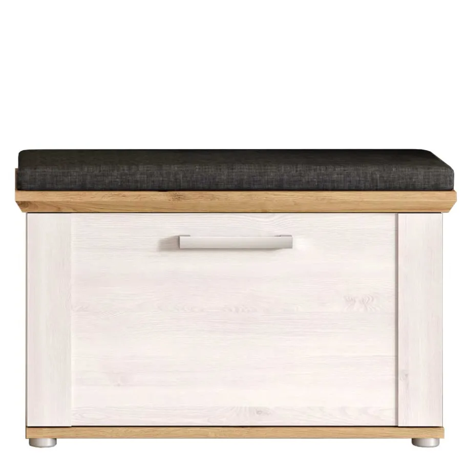Die Bank (80 x 47 x 39 cm) bietet hinter einer Klappe mit Metallbeschlägen vier praktische Fächer – ideal für bis zu vier Paar Schuhe (je nach Größe). Zwei verstellbare Einlegeböden und eine Mittelwand sorgen für Struktur. Die Sitzhöhe beträgt 47 cm – mit optionaler Polsterauflage (grauer Webstoff, 100 % Polyester) rund 52 cm. Silberfarbige Kunststoffgleiter und ein passender Bügelgriff runden das Bild ab.