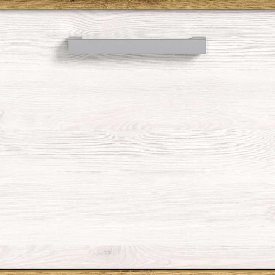 Alle Elemente sind aus robuster Spanplatte gefertigt, die Fronten in Lärche Weiß Holzoptik foliert, Korpus- und Paneelflächen melaminbeschichtet. Deckplatten und Böden zeigen sich in attraktiver Wildeiche Holzoptik. Silberfarbene Kunststoff-Bügelgriffe, stabile Metallbeschläge sowie Bodengleiter runden die Ausstattung ab. Eine Kippsicherung zur Wandbefestigung ist enthalten.