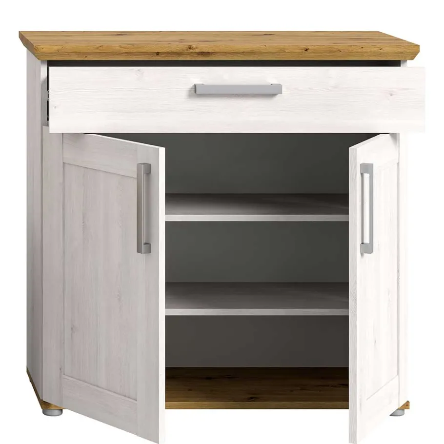 In der Kommode (95 x 92 x 39 cm) kombinieren sich eine Schublade mit Metallauszug und zwei Drehtüren. Dahinter befinden sich zwei verstellbare Einlegeböden für flexible Aufbewahrung – ideal z. B. für bis zu neun Paar Schuhe (je nach Größe). Der Mix aus Kassettenfront und silberfarbenen Griffen verleiht dem Möbel ländlichen Charme.
